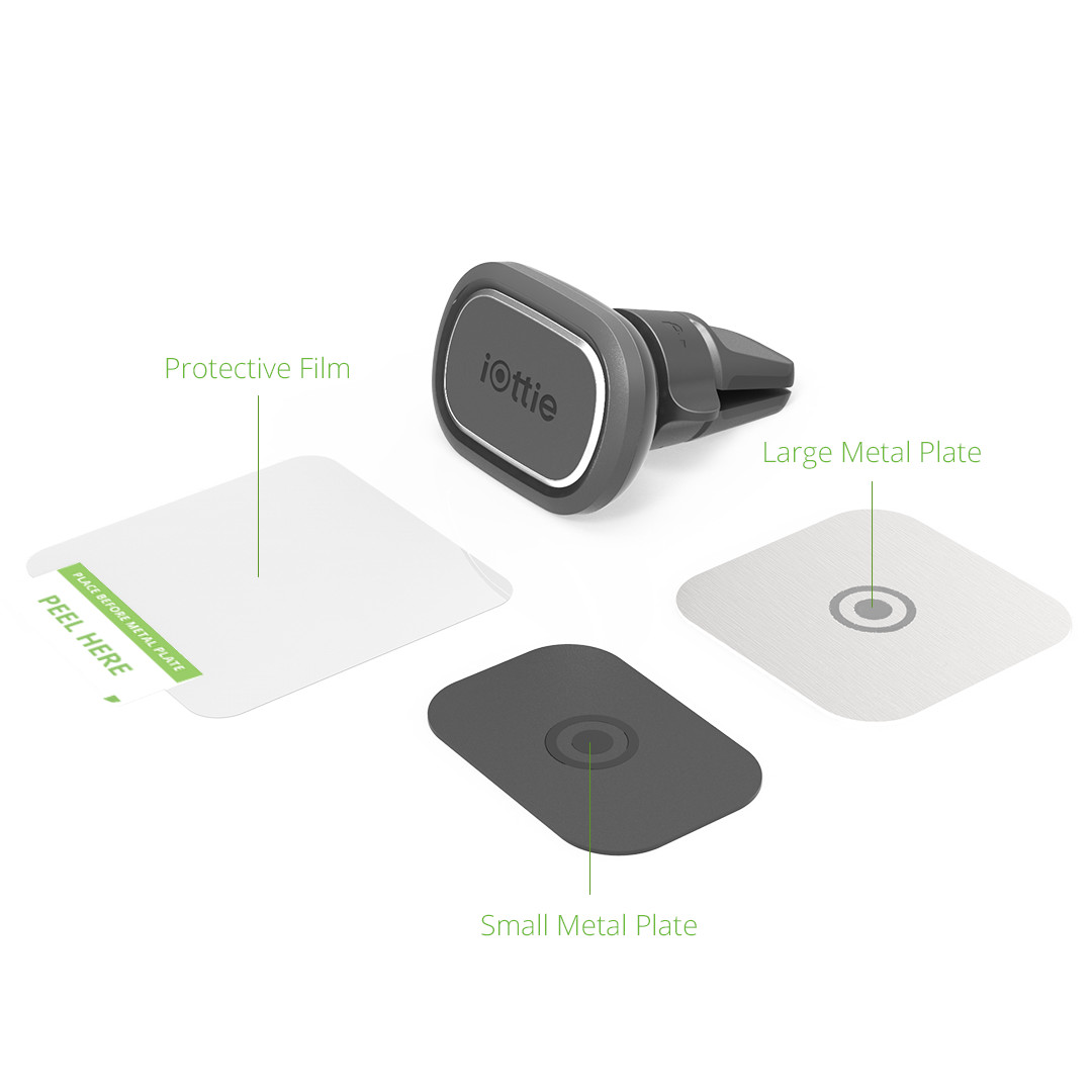 Một bộ miếng kim loại gồm miếng nhỏ và miếng lớn với một màng phim bảo vệ dính trực tiếp vào mặt sau của điện thoại hoặc ốp lưng, nhưng không ảnh hưởng tới sạc không dây khi đặt đúng vị trí tương ứng. Khóa xoay sẽ giữ chặt giá đỡ trên thanh cửa gió điều hòa.