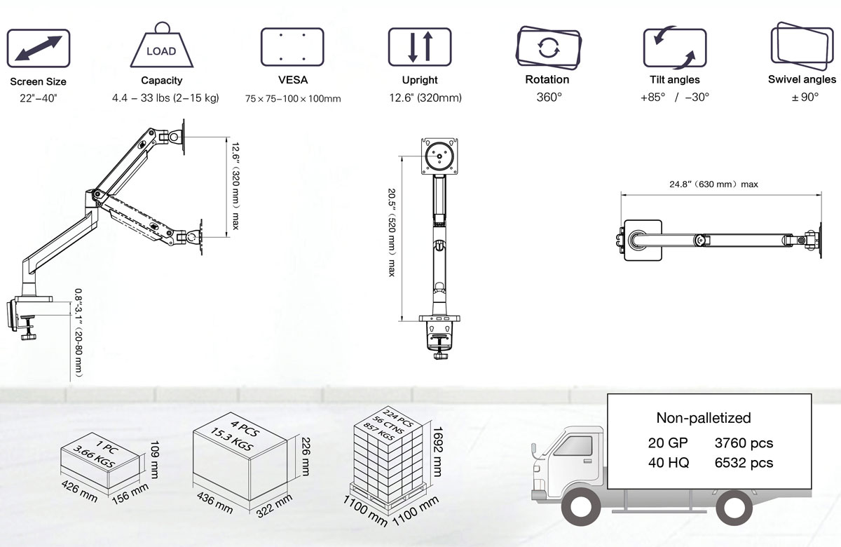Yêu cầu màn hình: - Từ 17” – 35” - Trọng lượng 7 kg - Phải có lỗ gắn chuẩn VESA (75x75mm & 100x100mm). Thông tin sản phẩm: - Màn hình di chuyển lên /