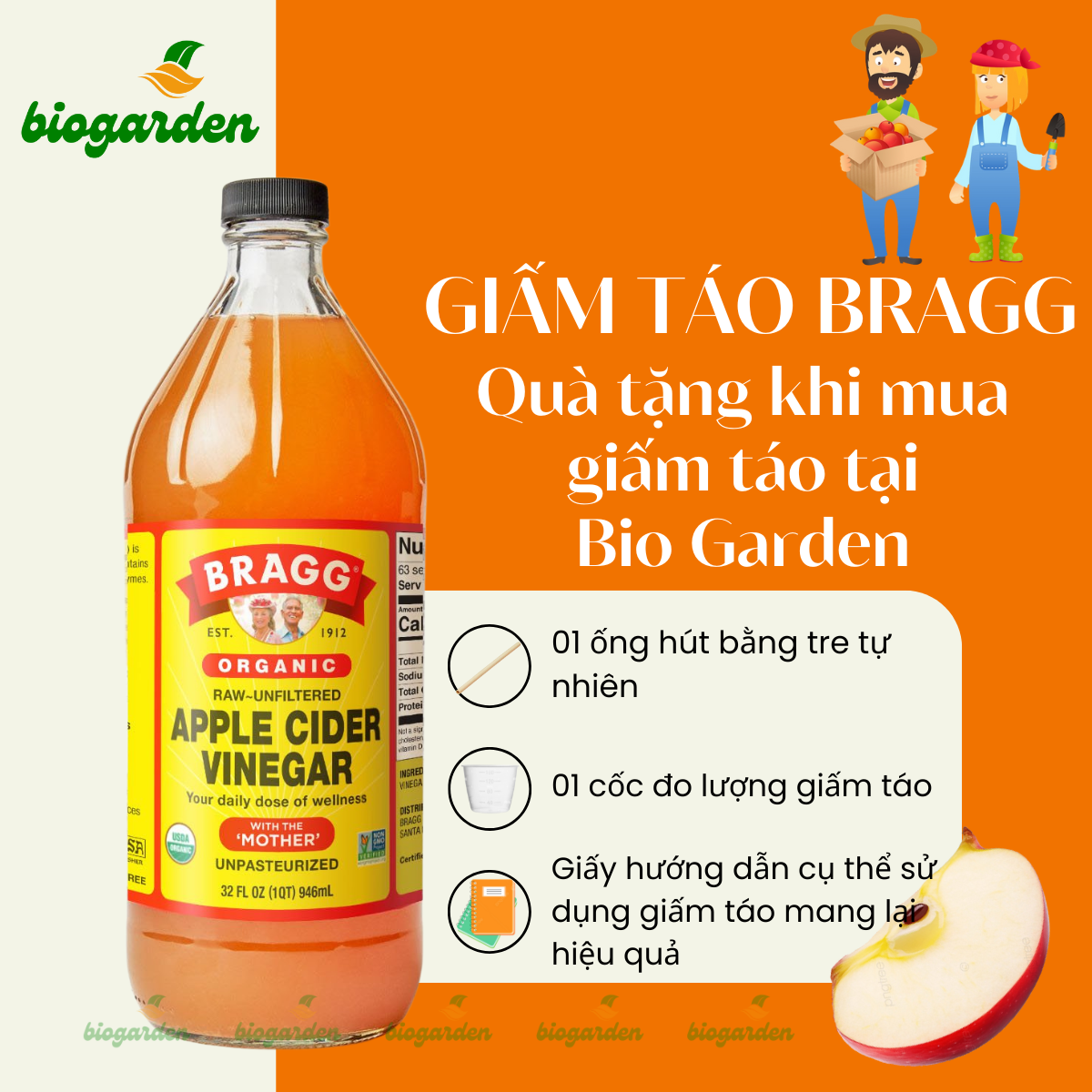 Giấm táo hữu cơ Bragg là thương hiệu nổi tiếng nhất nước Mỹ và toàn cầu. Đây là loại giấm đạt tiêu chuẩn hữu cơ USDA Organic. Đây cũng là loại giấm hữu cơ có chứa 5% acid được làm từ táo hữu cơ được trồng tại Hoa Kỳ, có giấm cái, thực sự “sống”, không khử trùng và không lọc. Quá trình thu hái, sản xuất, đóng gói, bảo quản, vận chuyển đều tuân thủ nguyên tắc chặt chẽ của cơ quan thuốc và thực phẩm của Hoa Kỳ FDA. Chính vì vậy mà màu sắc của giấm rất đặc trưng là từ màu hổ phách tới nâu vàng.