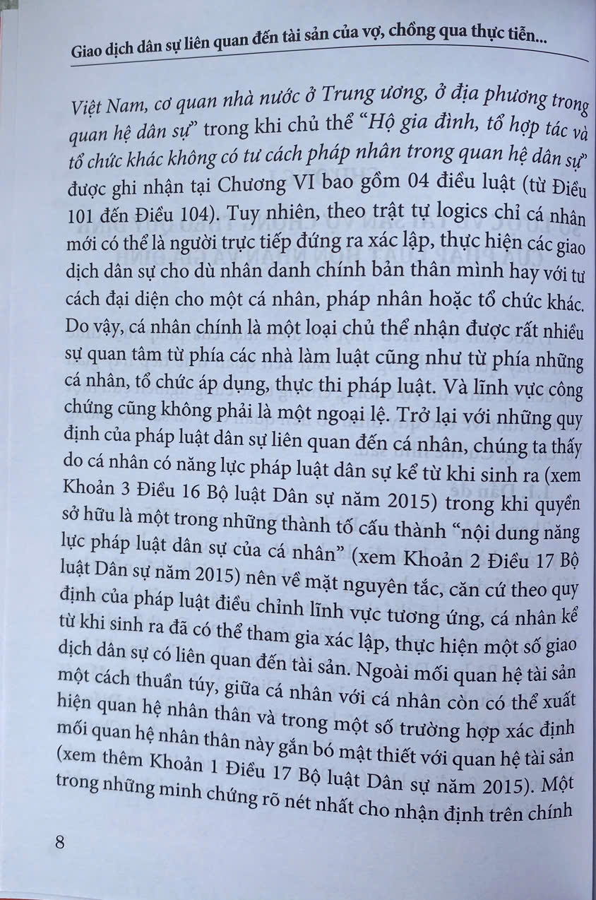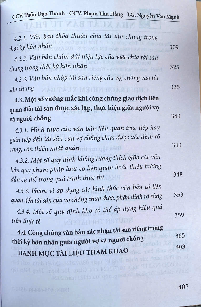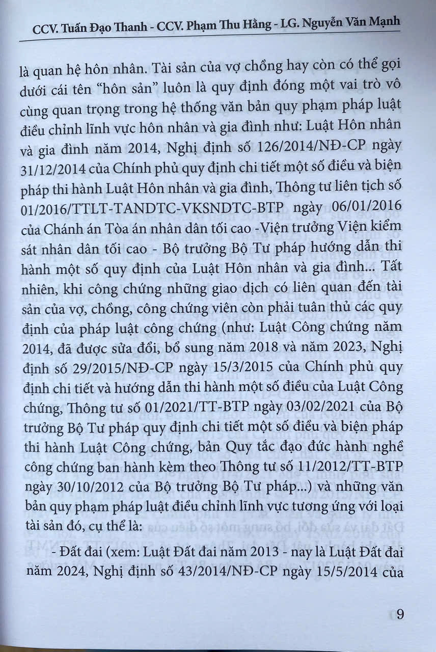 Nhằm cung cấp cho bạn đọc những quy định của pháp luật thực định xoay quanh mối quan hệ tài sản giữa người vợ và người chồng - một mối quan hệ tài sản gắn chặt với quan hệ nhân thân, cũng như một số vấn đề pháp lý mà công chứng viên cần quan tâm khi công chứng những văn bản liên quan trực tiếp hay gián tiếp đến tài sản của vợ chồng, Nhà xuất bản Tư pháp xuất bản cuốn: “Giao dịch dân sự liên quan tới tài sản của vợ, chồng qua thực tiễn hành nghề công chứng” của Công chứng viên Tuấn Đạo Thanh, Công chứng viên Phạm Thu Hằng và Luật gia Nguyễn Văn Mạnh.