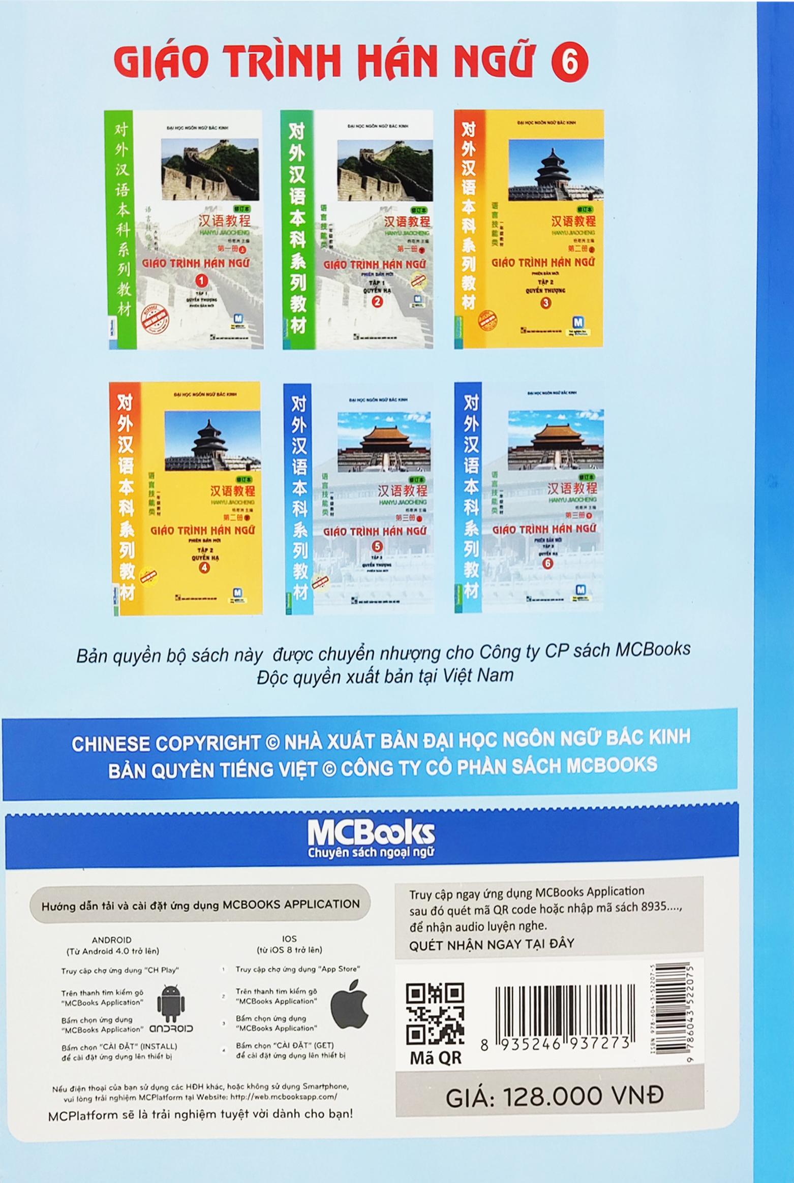 Giáo Trình Hán Ngữ 6 - Tập 3 - Quyển Hạ (Phiên Bản 3) Nếu coi Giáo trình Hán ngữ quyển 1, và Giáo trình Hán ngữ Quyển 2 là Giáo trình tiếng Trung sơ cấp; Thì Giáo trình Hán ngữ quyển 3, 4 là Giáo trình tiếng Trung trung cấp thì tới Giáo trình Hán ngữ quyển 5, 6 là giáo trình tiếng Trung cao cấp. Đây là quyển cuối trong bộ sách Giáo trình Hán Ngữ. Học hết quyển này thì bạn có thể thoải mái nói chuyện tiếng Trung, viết các đoạn văn khá tốt. Bạn cũng sẽ dễ dàng thi HSK 5 hơn. Tầm này thì đi xin việc cũng chả còn đáng lo nữa. Nếu bạn chăm chỉ thì còn có thể phiên dịch tốt ý chứ. Giáo trình Hán ngữ 6 – Tập 3 – Quyển hạ – Phiên bản 3 mới nhất là cuốn sách được biên soạn kỹ lưỡng từ bộ giáo trình cũ. Bên cạnh những kiến thức cũ thì hiện nay cuốn giáo trình đã được biên soạn lại bổ sung rất nhiều kiến thức. Với lượng từ mới khổng lồ cuốn sách sẽ hứa hẹn mang đến cho các bạn một trải nghiệm vô cùng thú vị với tiếng Trung