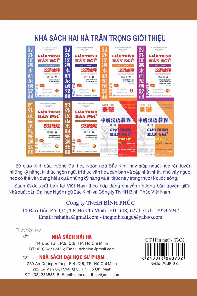Giáo Trình Hán Ngữ Boya - Sơ Cấp Tập 2 (Sách Bài Tập Kèm Đáp Án) Cuốn sách tiếng Trung thuộc trình độ sơ cấp giúp người học tăng vốn từ vựng và ngữ pháp một cách nhanh chóng Ở Việt Nam hiện nay, tiếng Trung là một trong bốn ngoại ngữ phổ biến nhất. Số lượng người học tiếng Trung tăng qua từng ngày, bởi đây là môn ngoại ngữ giúp người học mở ra nhiều cơ hội cả trong học tập lẫn công việc. Bạn đang là học sinh, sinh viên muốn học thêm tiếng Trung để nâng cao tầm hiểu biết cũng như phục vụ cho học tập Bạn muốn nhập hàng từ Trung Quốc để kinh doanh nhưng lại không biết tiếng Trung nên mất rất nhiều chi phí cho trung gian Bạn muốn học tiếng Trung để phục vụ cho công việc Vấn đề của các bạn là: Bạn là người mới bắt đầu học tiếng Trung, bạn không biết nên tự học, tự ôn luyện ở nhà như thế nào? Ngữ pháp và Vốn từ vựng của bạn bị hạn chế, làm sao để nâng cao cả 2 yếu tố này? Kỹ năng đọc và viết rất quan trọng và cần được cải thiện nhưng đây lại là 2 kỹ năng khó và các bạn chưa biết nên cải thiện 2 kỹ năng này như thế nào? Nếu câu trả lời của bạn cho 3 vấn đề trên vẫn là KHÔNG hoặc CHƯA thì bộ giáo trình Hán ngữ Boya sơ cấp chính là giải pháp tốt nhất dành cho các bạn. Thông qua tập 1 các bạn đã được 30 bài đầu của trình độ sơ cấp. Tập 2 sẽ cung cấp cho các bạn 25 bài còn lại của trình độ này. Vì sao cuốn giáo trình tiếng Trung này có thể giải quyết hết những vấn đề của bạn? Trình bày khoa học, chi tiết phù hợp cho việc tự học, tự ôn tập sau những giờ học trên lớp Mỗi bài học chia ra các đơn nguyên. Mỗi đơn nguyên bao gồm các bài. Trước đơn nguyên có phần luyện, sau đơn nguyên là bài tập. Hoạt động luyện tập đơn nguyên có hình thức đa dạng, mục đích là giúp học sinh nhớ lại tri thức ngôn ngữ đã có hoặc chuẩn bị cho việc học đơn nguyên mới. Bài tập của các chủ đề gồm nhiều tầng kiến thức, từ kết cấu âm tiết chữ Hán, ngữ tố, từ hội cho đến các bài văn, giúp học sinh củng cố, hấp thu và vận dụng kết cấu ngôn ngữ của chủ đề. Phần cuối mỗi chủ đề đều có bài đọc và viết bài tập. Bài đọc tái hiện từ hội và điểm ngôn ngữ trong mỗi chủ đề. Chủ yếu là luyện tập năng lực viết bài cho học sinh, ngoài ra còn luyện cho học sinh kỹ năng ứng dụng kết cấu ngôn ngữ trong mỗi chủ đề. Với cách trình bày này các bạn hoàn toàn có thể tự học, tự ôn luyện sau những giờ lên lớp mà vẫn hiệu quả. Luyện tập nhiều cấu trúc ngữ pháp và từ vựng từ đó tăng khả năng đọc, viết của người học Trọng tâm của cuốn sách là công năng huấn luyện ngôn ngữ và tuyển chọn ngữ liệu tự nhiên xoay quanh sự hứng thú của người học. Từng bài học các bạn sẽ được ôn luyện từ vựng cùng các ngữ pháp trọng điểm. Qua phần lý thuyết các bạn sẽ được làm các bài tập liên quan tới phần lý thuyết vừa học nhằm củng cố và nâng cao kiến thức nhanh chóng. Mỗi bài học các bạn sẽ được hệ thống lại khoảng 20 từ vựng với phiên âm pinyin giúp các bạn có thể đọc được chữ Hán. Qua cách trình bày này các bạn sẽ tăng được khả năng đọc cũng như khả năng sử dụng văn phong linh hoạt. Cung cấp các bài tập luyện viết bám sát từng bài học Phần luyện viết giúp các bạn luyện tập các từ vựng theo từng bài học với nhiều dạng bài tập. Người học sẽ được làm các dạng bài như: Viết phiên âm từ vựng, điền từ vào chỗ trống, viết đoạn văn, luyện viết theo mẫu,… Hệ thống các bài tập này chính là nguồn tài liệu để các bạn ôn luyện cho các bài kiểm tra, bài thi. Phần luyện viết có sẵn các nét mờ, những chữ đầu bạn có thể tô lại để quen nét chữ và thứ tự các nét, từ đó tạo thói quen để tự viết những chữ sau.