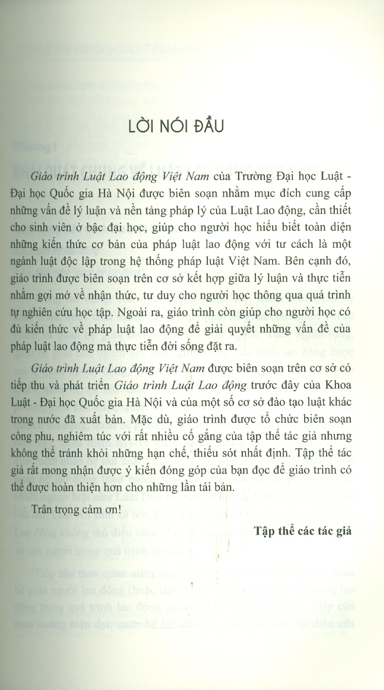 Giáo trình Luật Lao động Việt Nam của Trường Đại học Luật - Đại học Quốc gia Hà Nội được biên soạn nhằm mục đích cung cấp những vấn đề lý luận và nền tảng pháp lý của Luật Lao động, cần thiết cho sinh viên ở bậc đại học, giúp cho người học hiểu biết toàn diện những kiến thức cơ bản của pháp luật lao động với tư cách là một ngành luật độc lập trong hệ thống pháp luật Việt Nam. Bên cạnh đó, giáo trình được biên soạn trên cơ sở kết hợp giữa lý luận và thực tiễn nhằm gợi mở về nhận thức, tư duy cho người học thông qua quá trình tự nghiên cứu học tập. Ngoài ra, giáo trình còn giúp cho người học có đủ kiến thức về pháp luật lao động để giải quyết những vấn đề của pháp luật lao động mà thực tiễn đời sống đặt ra. Giáo trình Luật Lao động Việt Nam được biên soạn trên cơ sở có tiếp thu và phát triển Giáo trình Luật Lao động trước đây của Khoa Luật - Đại học Quốc gia Hà Nội và của một số cơ sở đào tạo luật khác trong nước đã xuất bản. Mặc dù, giáo trình được tổ chức biên soạn công phu, nghiêm túc với rất nhiều cố gắng của tập thể tác giả nhưng không thể tránh khỏi những hạn chế, thiếu sót nhất định. Tập thể tác giả rất mong nhận được ý kiến đóng góp của bạn đọc để giáo trình có thể được hoàn thiện hơn cho những lần tái bản.