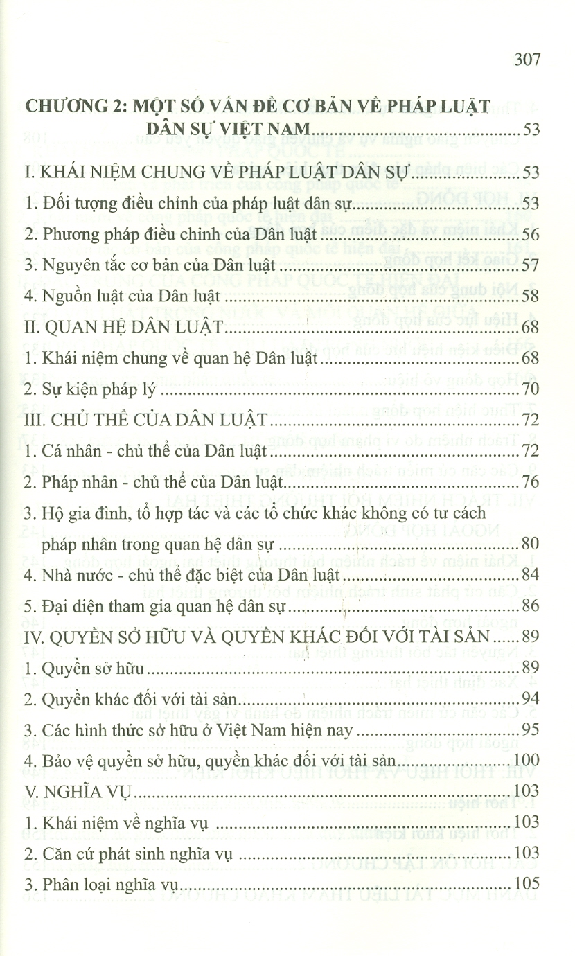 Giáo trình cũng đề cập tới những nguyên lý chung về ký kết và thực hiện hợp đồng dân sự, về thời hiệu tố tụng, về quan hệ dân sự có yếu tố nước ngoài và áp dụng pháp luật nước ngoài trong các quan hệ dân sự có yếu tố nước ngoài