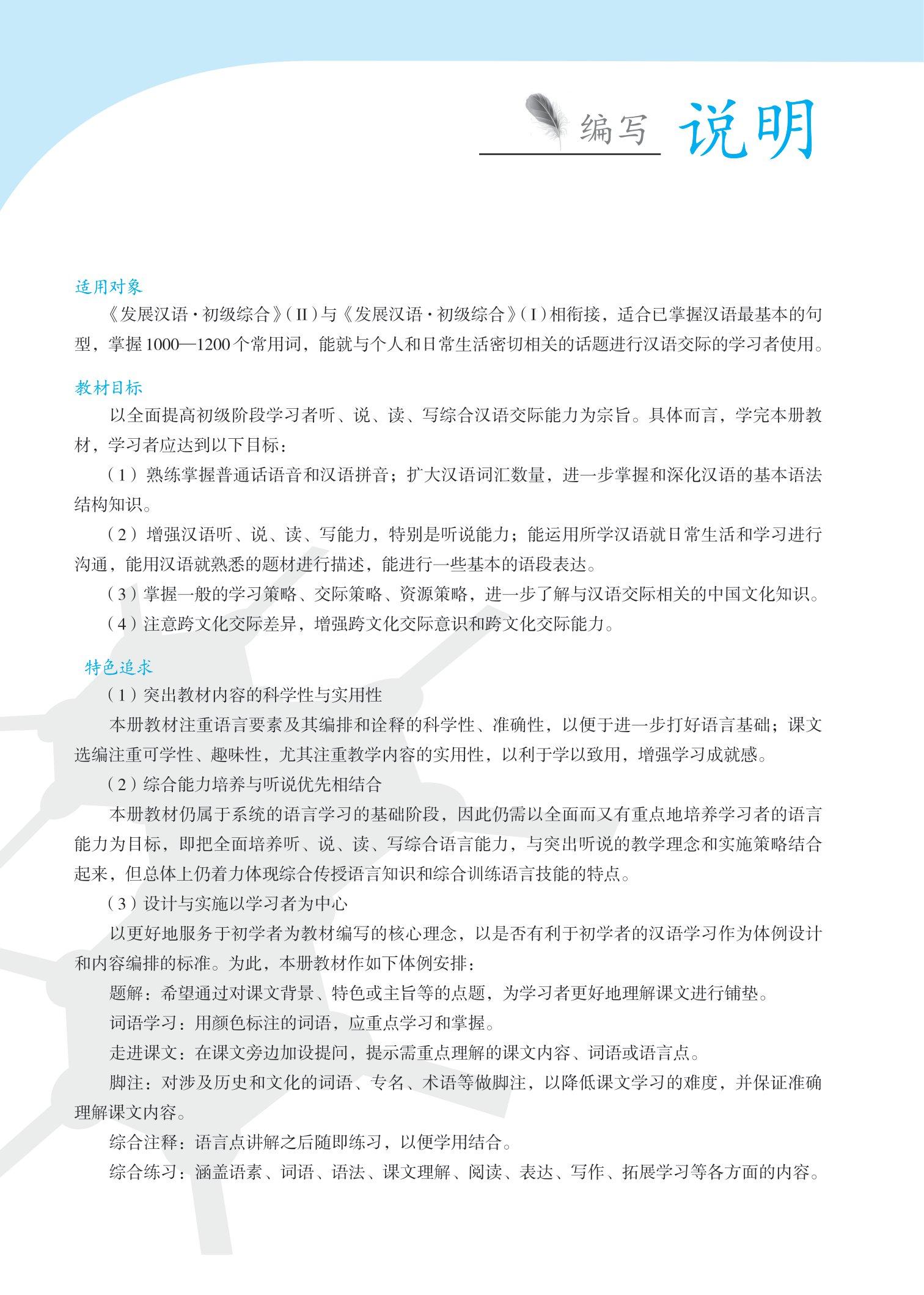 Giáo trình Phát triển Hán ngữ tổng hợp sơ cấp 2 – Tập 2 chủ yếu dùng cho sinh viên học tiếng Trung Quốc, có thể đáp ứng được yêu cầu giảng dạy của môn học chính ở các cấp độ như sơ cấp (bao gồm mới bắt đầu). Bên cạnh đó, cuốn sách này có thể chọn dùng cho giảng dạy sinh viên chính quy chuyên ngành ngôn ngữ Trung Quốc, cũng có thể dùng cho các khóa bồi dưỡng trong và ngoài nước và cho người tự học tiếng Trung Quốc.