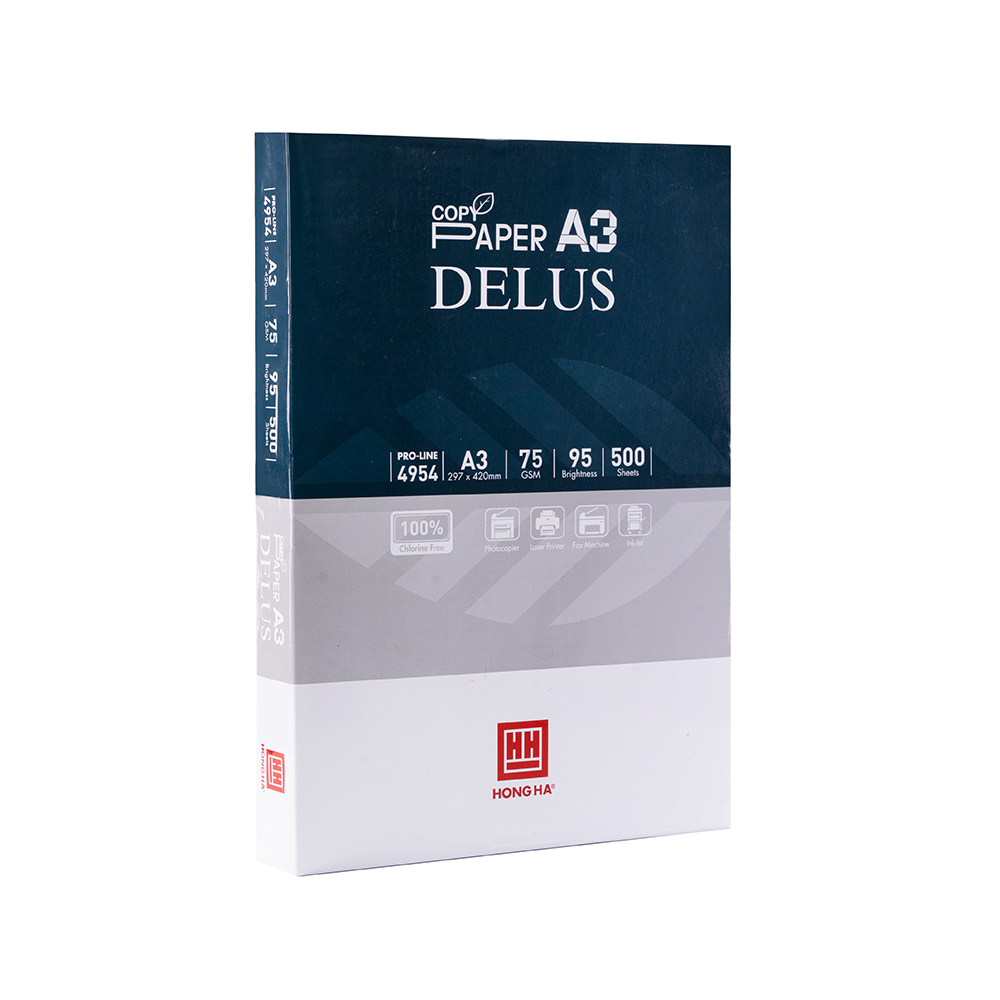 Giấy in A3 Hồng Hà Delus 75gsm - 4954 là sản phẩm giấy xuất xứ từ Indonesia, được sản xuất với công nghệ tiên tiến, hiện đại, đóng gói bằng dây chuyền hoàn toàn tự