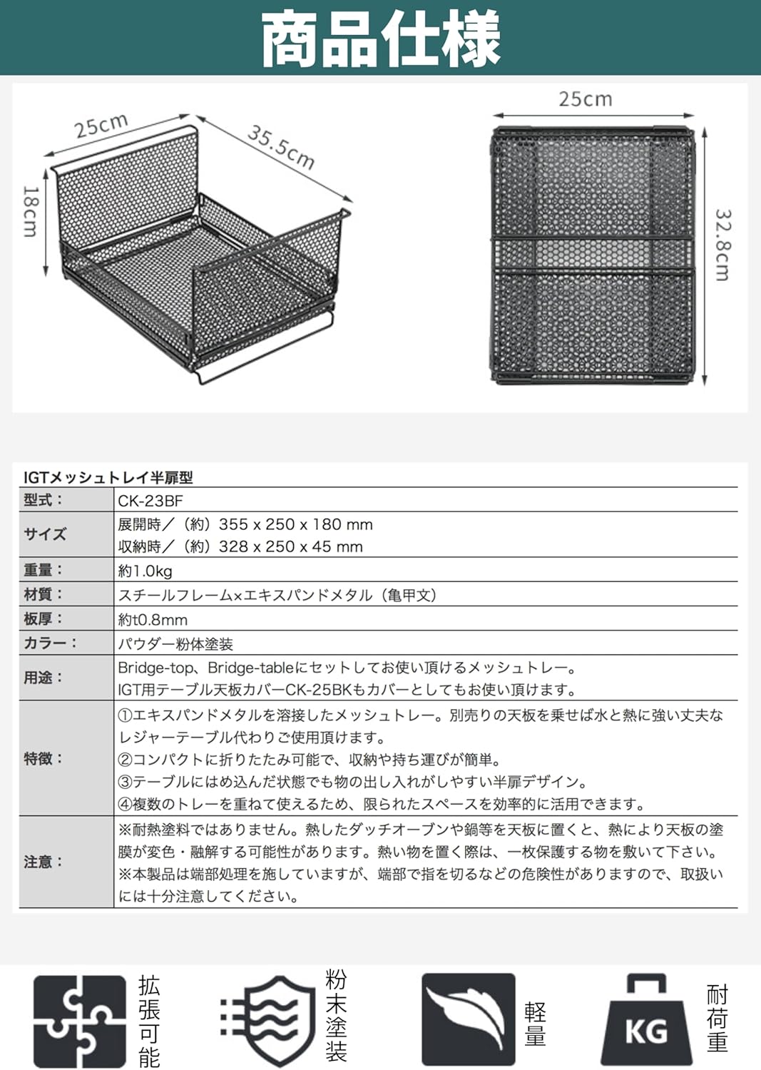 Mặt bàn IGT Campingmoon CK-3650 thiết kế 2 mô đun tiêu chuẩn cho hệ IGT có thể kết hợp và tùy chỉnh cá nhân hóa theo ý muốn người sử dụng. Chất liệu sắt mạ