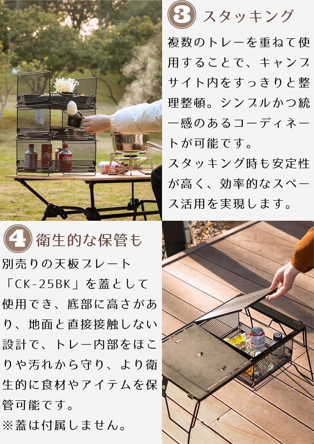 - Tính năng: Dùng với Bàn nướng, kệ CK, Khung IGT, Entry IGT, Khay lưới mỏng IGT Ứng dụng: Bàn nướng, Tấm chắn giữa cho Bàn cầu CK, Khung IGT, Khay lưới IGT, Khay lưới mỏng IGT Giỏ lưới IGT có kết cấu kim loại chắc chắn, chuyên nghiệp, hài hòa với môi trường ngoài trời khắc nghiệt, kết hợp giữa tính thực dụng và thiết kế. Tuyệt vời khi sử dụng làm giá để đồ xếp chồng, biến khu cắm trại của bạn thành một không gian đơn giản và đồng nhất. Thiết kế giúp dễ dàng lắp đặt và tháo dỡ đồ đạc ngay cả khi đặt trên bàn. Thiết kế đa năng, có thể sử dụng úp ngược làm bàn hoặc giá đỡ Thông số kỹ thuật kim loại chuyên nghiệp, chắc chắn và bền bỉ: Không phải lưới thép thông thường, sản phẩm được làm từ kim loại chuyên nghiệp với họa tiết mai rùa. Tạo nên vẻ ngoài chắc chắn và bền bỉ. Được hàn để tạo nên lớp hoàn thiện chắc chắn, tạo nên vẻ ngoài phù hợp cho các hoạt động ngoài trời. Sản phẩm cũng có thể được sử dụng làm giá để đồ bằng sắt để tăng độ bền và phong cách. Có thể xếp chồng và dễ dàng phối hợp với khu cắm trại của bạn: Nhiều giỏ có thể được xếp chồng lên nhau để giữ cho khu cắm trại của bạn gọn gàng và ngăn nắp. Sản phẩm có thể được phối hợp với vẻ ngoài đơn giản và đồng nhất. Ổn định và tận dụng không gian hiệu quả khi xếp chồng