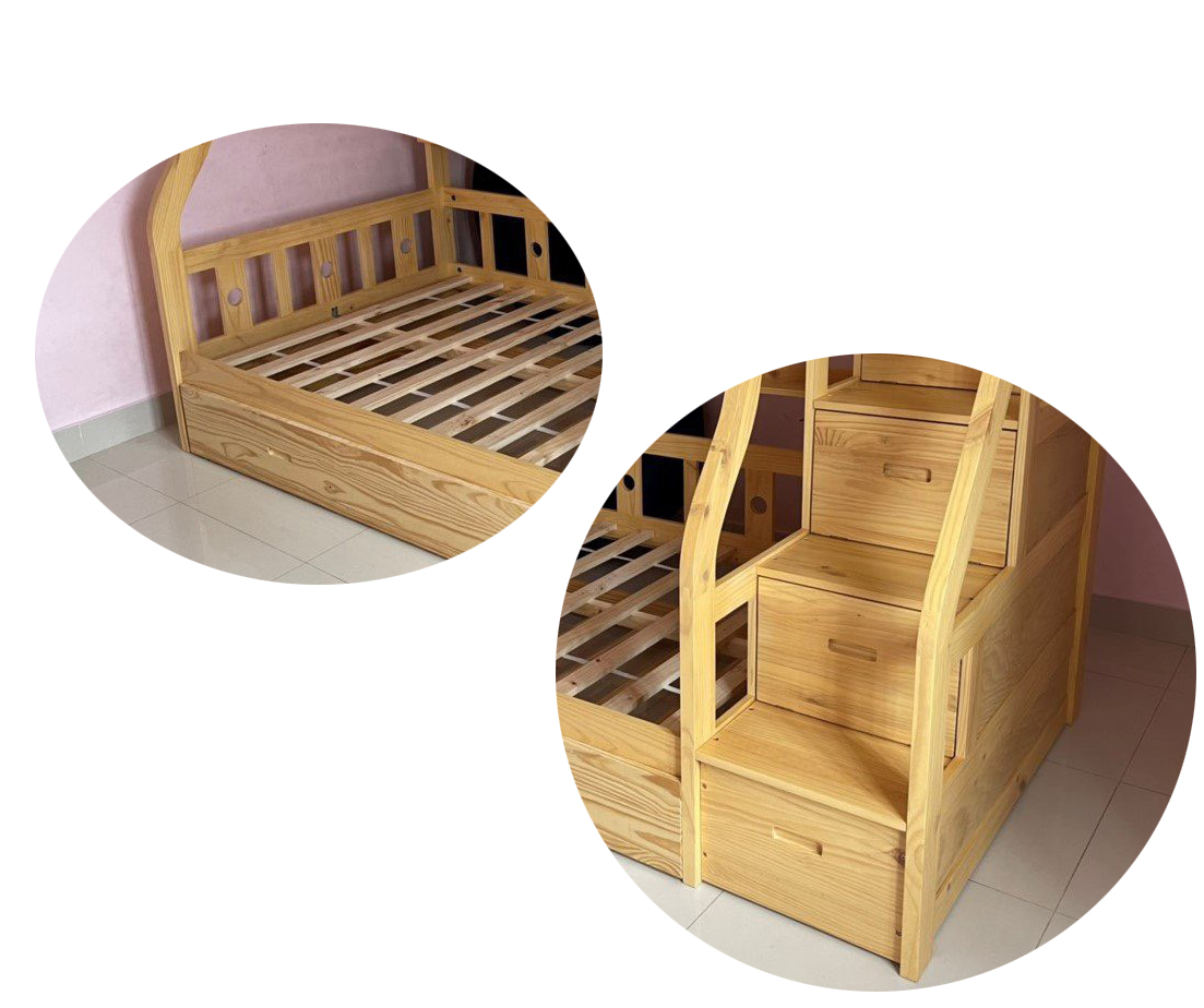 - Cầu thang chắc chắn với các bậc thang có kích thước tương đối lớn, đảm bảo an toàn cho bé khi di chuyển. Giường tầng trẻ em cao cấp là một sản phẩm thiết thực cho các gia đình có con nhỏ. Cùng với ưu điểm tiết kiệm không gian.