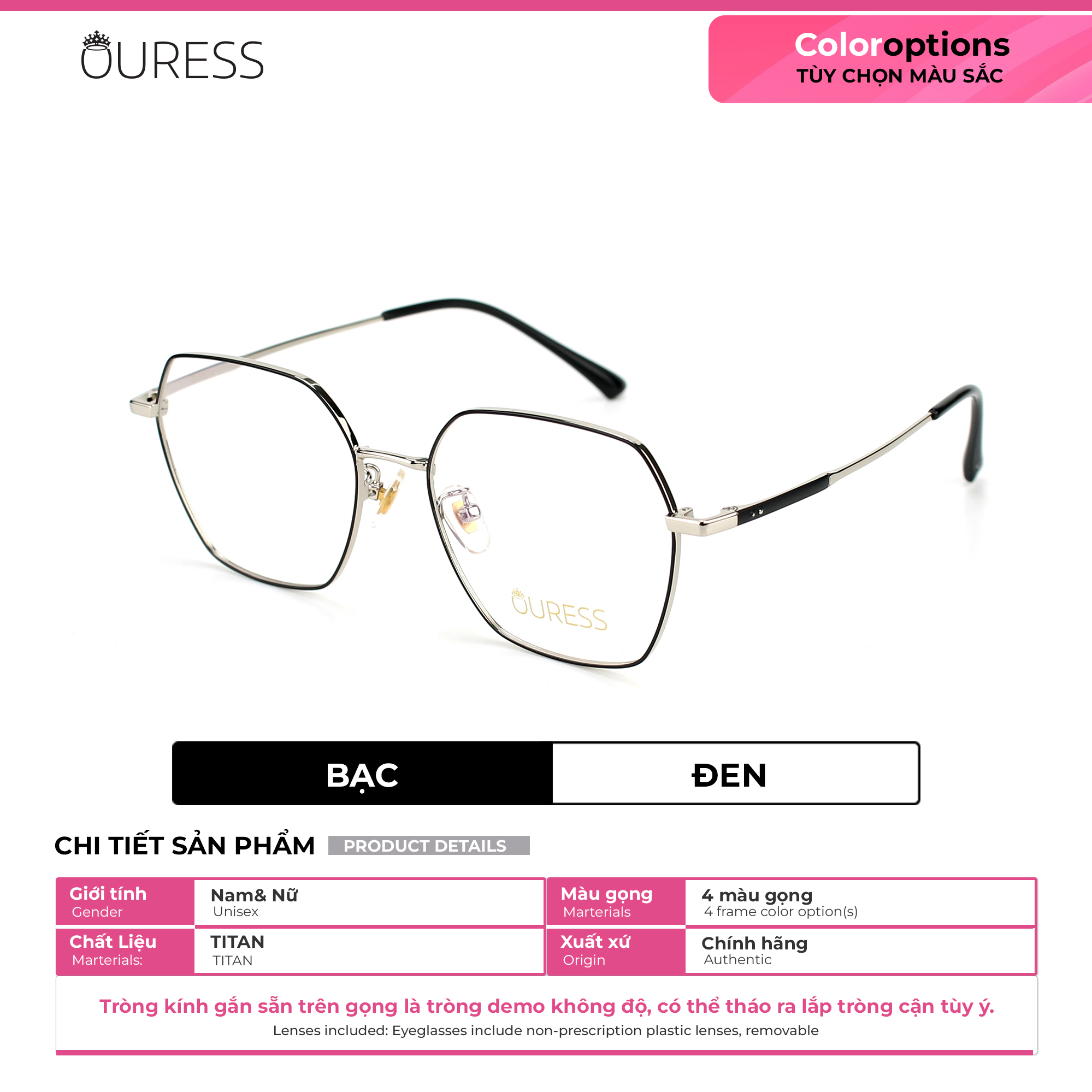 - Gọng kính bằng chất liệu kim loại cao cấp, bền và tạo cảm giác thoải mái cho người sử dụng. - Có thể thay tròng 0 độ/cận/viễn/loạn theo nhu cầu sử dụng. - Dáng