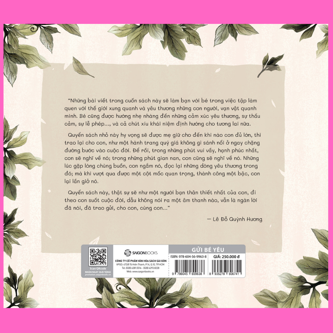 Đã từng là một người mẹ trẻ, cô Quỳnh Hương thấu hiểu tình thương yêu con vô bờ bến từ khi con là một cái mầm nhỏ xíu trong bụng mẹ. Cùng cảm nhận con lớn lên từng ngày, rồi tới ngày con chào đời, dần thích nghi với sự có mặt của một ‘nhân vật’ mới, đáng yêu nhưng cũng thiệt rắc rố, để cùng nhau, chúng ta phát triển thành một mối dây liên kết thiêng liêng của tình mẫu tử.