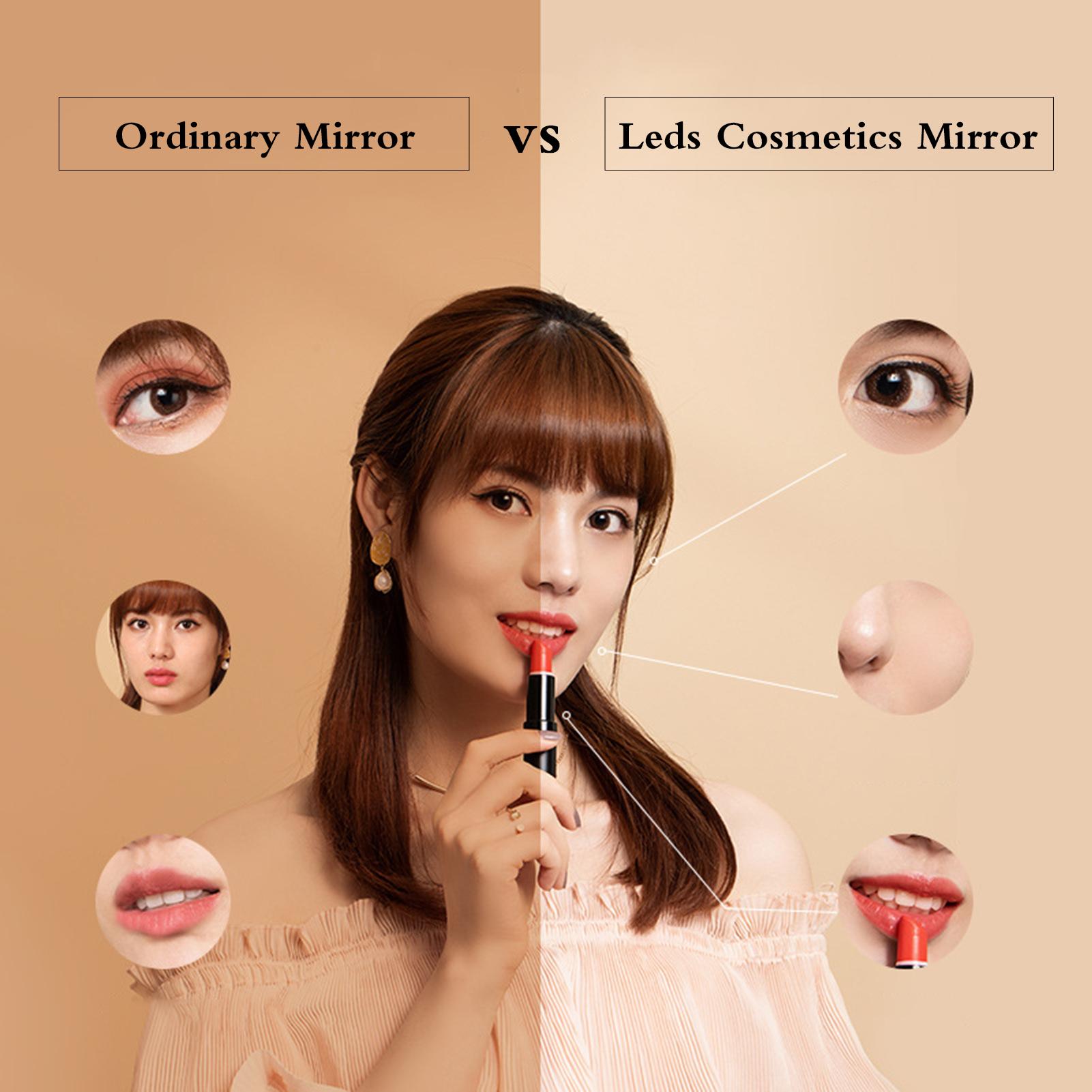 Features: Natural and simple style, brings you nice mood. High clear mirror surface, show your real looks without distortion. Leds light around the mirror, you can use the mirror even in the dark environment. Stepless