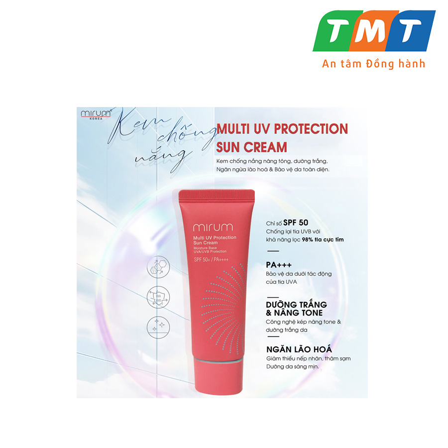 Kem chống nắng nâng tông, dưỡng trắng, ngừa lão hóa và bảo vệ da toàn diện Mirum 50ml – Mirum Multi UV Protection Sun Cream SPF 50+/PA+++ THÔNG TIN SẢN PHẨM Kem chống nắng