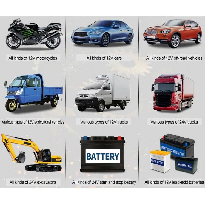 • Tương thích đa năng: Sạc được ắc quy 12V và 24V cho ô tô, xe máy, xe tải, xe điện, bình điện năng lượng mặt trời, v.v.
