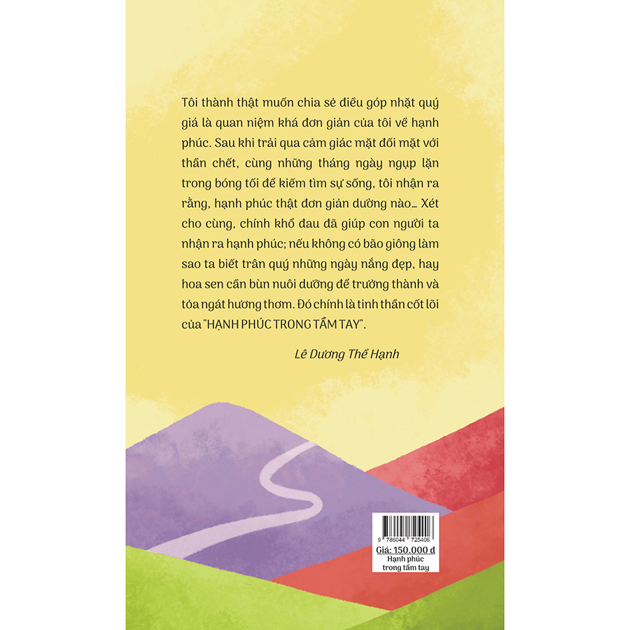 Mua tại TiktokI. THÔNG TIN CHUNG VỀ SÁCH "HẠNH PHÚC TRONG TẦM TAY" Nhà xuất bản Phụ nữ Việt Nam vừa phát hành tác phẩm "Hạnh phúc trong tầm tay" của tác giả Lê Dương Thể Hạnh vào tháng 10/2023 trên toàn quốc, nhân dịp ngày Phụ nữ Việt Nam 20/10 - tháng tôn vinh nữ giới, đặc biệt những tác giả nữ. Có thể nói, "Hạnh phúc trong tầm tay" của Lê Dương Thể Hạnh ra mắt bạn đọc rất đúng thời điểm, vì đây là dịp cô có thể chia sẻ nhiều điều về hành trình tìm đến mặt trời của mình… Hạnh phúc trong tầm tay của tác giả Lê Dương Thể Hạnh thuộc dòng sách bổ trợ kỹ năng sống, là "rút ruột" chia sẻ từ tác giả về những đức tính quý báu mà con người cần có trong đời để cuộc sống trở nên chất lượng, trọn vẹn hơn. Là một tác giả khuyết tật, viết sách bằng phần mềm hỗ trợ giọng nói và nhờ sự giúp đỡ của cộng sự, Lê Dương Thể Hạnh cho thấy một nghị lực phi thường trong việc gieo những con chữ thiện lương, được trau chuốt cẩn thận để giúp vun bồi tâm hồn những bạn đọc "thuận duyên" đọc sách. Đồng hành cùng bóng tối hơn 15 năm, hơn ai hết, tác giả thấu hiểu việc "vượt tối" để tìm đến ánh sáng lương thiện trong "cõi người ta" này vô cùng gian nan. Và với những người thuộc nhóm "còn lại" như chính bản thân tác giả - khuyết tật đủ thứ, khả năng di chuyển và hoạt động hạn chế - hành trình "vượt tối" còn gian nan hơn gấp nhiều lần. Tuy vậy, chị không bỏ cuộc. Ở độ tuổi mà mọi người đã yên bề gia thất, con cái lớn khôn, tác giả Lê Dương Thể Hạnh, như bộc bạch của chị trong các trang sách, vẫn vui vẻ bên gia đình, cha mẹ, vẫn tận hưởng cuộc sống theo cách của riêng mình, và để biết rằng, ngày nào còn thở trên cuộc đời này thôi đã là may mắn lắm rồi. Nhưng những điều mà chị muốn độc giả hướng đến không dừng lại ở đó. Chị tâm sự: "Đến với Hạnh phúc trong tầm tay, có lẽ bạn sẽ tạm quên đi những nỗi đau ở quá khứ, và bạn cũng xa rời gánh nặng áo cơm để trở về với những giá trị - rất bình dị và rất chân thật từ trong sâu thẳm tâm hồn mình". Các chủ đề mà tác giả Lê Dương Thể Hạnh xoáy sâu vào gồm có bình yên, bao dung, khiêm tốn, yêu thương, lễ - nghĩa - trí - tín, tương trợ, tự do và hạnh phúc. Tuy xa mà gần, tuy gần mà xa, chị dẫn dắt độc giả qua từng chủ đề một cách dí dỏm, lối dẫn chuyện có duyên, văn phong khúc chiết để thấy được rằng, hạnh phúc không ở đâu xa mà nằm trong lòng bàn tay ta! Chị bộc bạch: "… Khi may mắn được sinh ra với cơ thể và trí não của một con người, có lẽ ta nên kích hoạt sóng não dành cho con người, vượt qua những nỗi sợ, mạnh dạn tiến về phía trước để đón nhận một tương lai tốt đẹp và thanh thản lưu lại những điều kỳ diệu cho cuộc đời. Và đây chính là tinh thần cốt lõi của "HẠNH PHÚC TRONG TẦM TAY"".