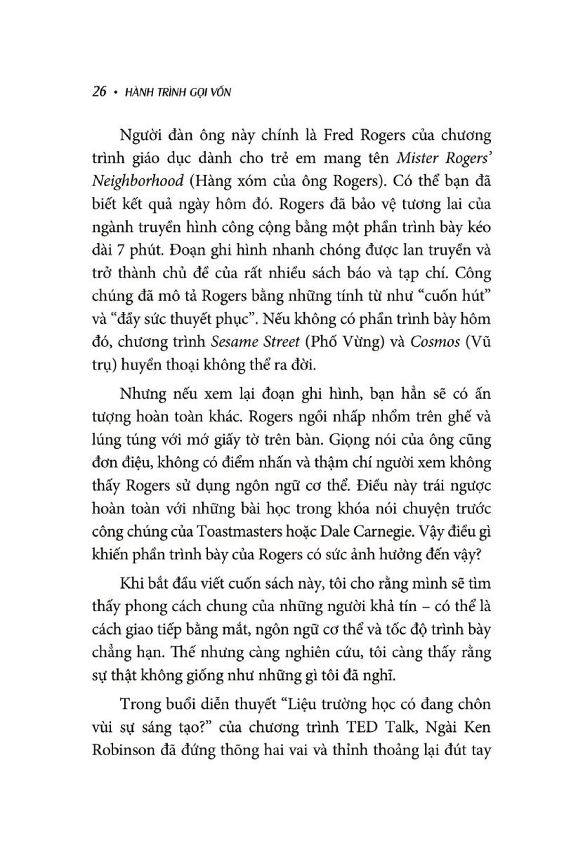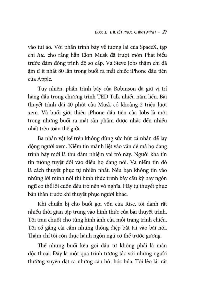 Do đó, tác giả đã viết Hành trình gọi vốn. Cuốn sách này sẽ trình bày 7 điều chỉnh, tương ứng với 7 bước để trở thành người khả tín, từ đó giúp bạn chinh phục các nhà đầu tư, có thêm người ủng hộ và tiến xa hơn trên hành trình đến với thành công.