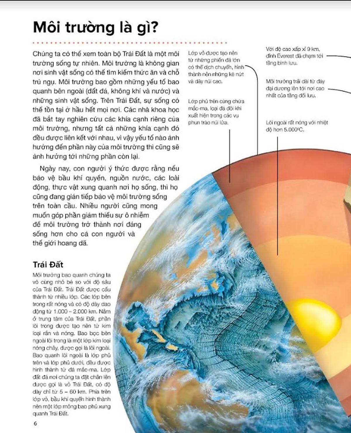 Môi Trường - là một cuốn sách đưa bạn băng qua những chuyến khám phá về môi trường sống của con người chúng ta - từ đất đá nằm dưới chân cho đến những đám mây lững lờ trôi trên bầu trời - một thế giới tuyệt vời, đa dạng sự kết nối của những chu trình, hệ thống và tiến trình sống trong tự nhiên. Thông qua cuốn sách này, độc giả có thể hiểu thêm về quá trình hiệu ứng nhà kính diễn ra như thế nào, lý do động vật phải di cư mỗi năm, vòng tuần hoàn của nước bao gồm những giai đoạn nào… Bên cạnh đó, cuốn sách còn đề cập đến những tác động từ hoạt động khai thác môi trường của con người, sau đó đưa ra các giải pháp giúp con người bảo vệ hành tinh sống của chính m.ình.