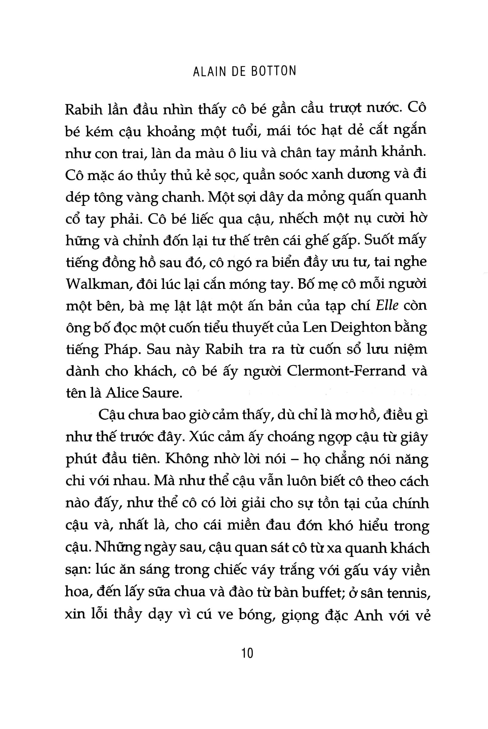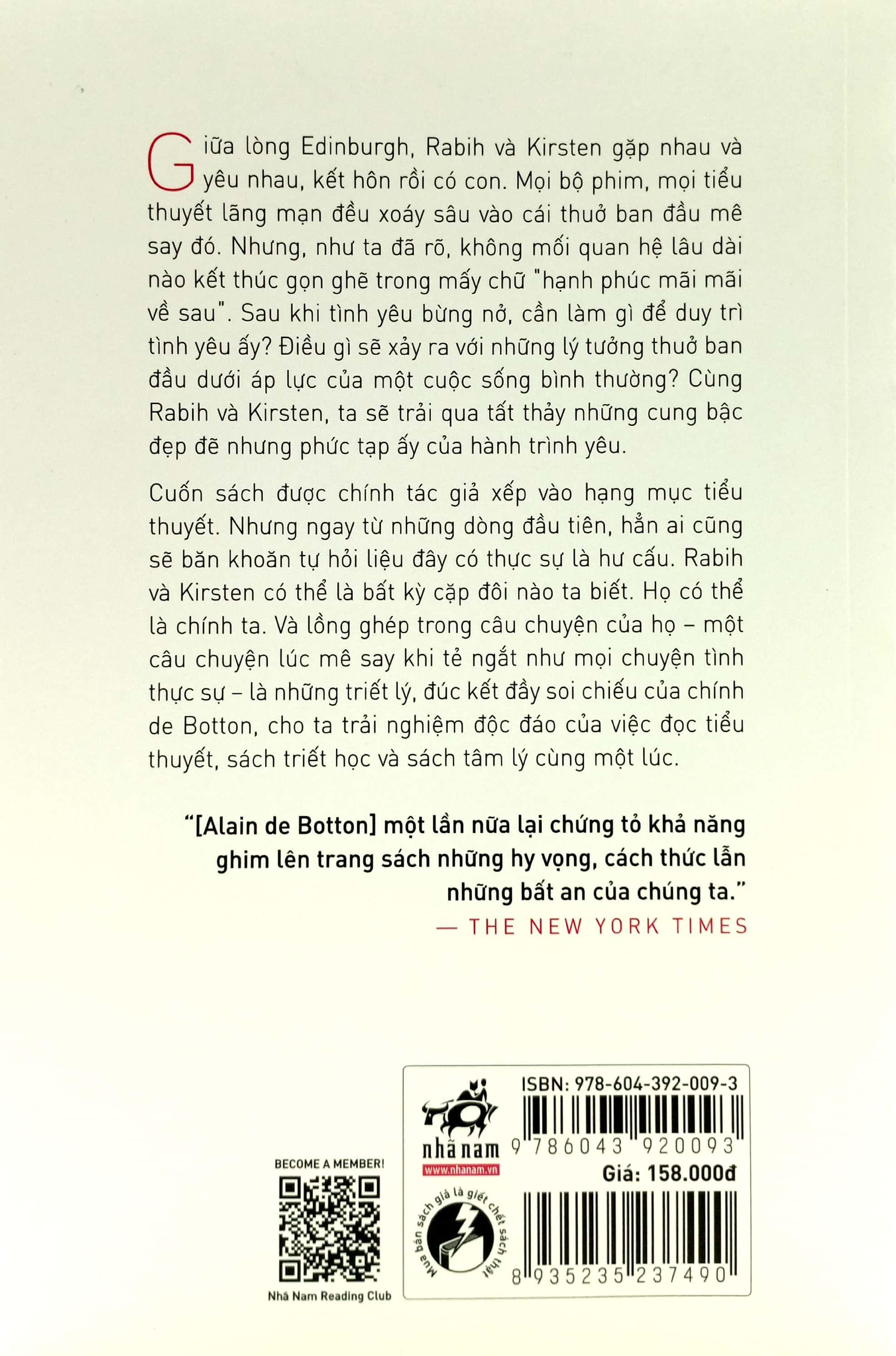Cuốn sách được chính tác giả xếp vào hạng mục tiểu thuyết. Nhưng ngay từ những dòng đầu tiên, hẳn ai cũng sẽ băn khoăn tự hỏi liệu đây có thực sự là hư cấu. Rabih và Kristen có thể là bất kỳ cặp đôi nào ta biết. Họ có thể là chính ta. Và lồng ghép trong câu chuyện của họ – một câu chuyện lúc mê say khi tẻ ngắt như mọi chuyện tình thực sự – là những triết lý, đúc kết đầy soi chiếu của chính de Botton, cho ta trải nghiệm độc đáo của việc đọc tiểu thuyết, sách triết học và sách tâm lý cùng một lúc.