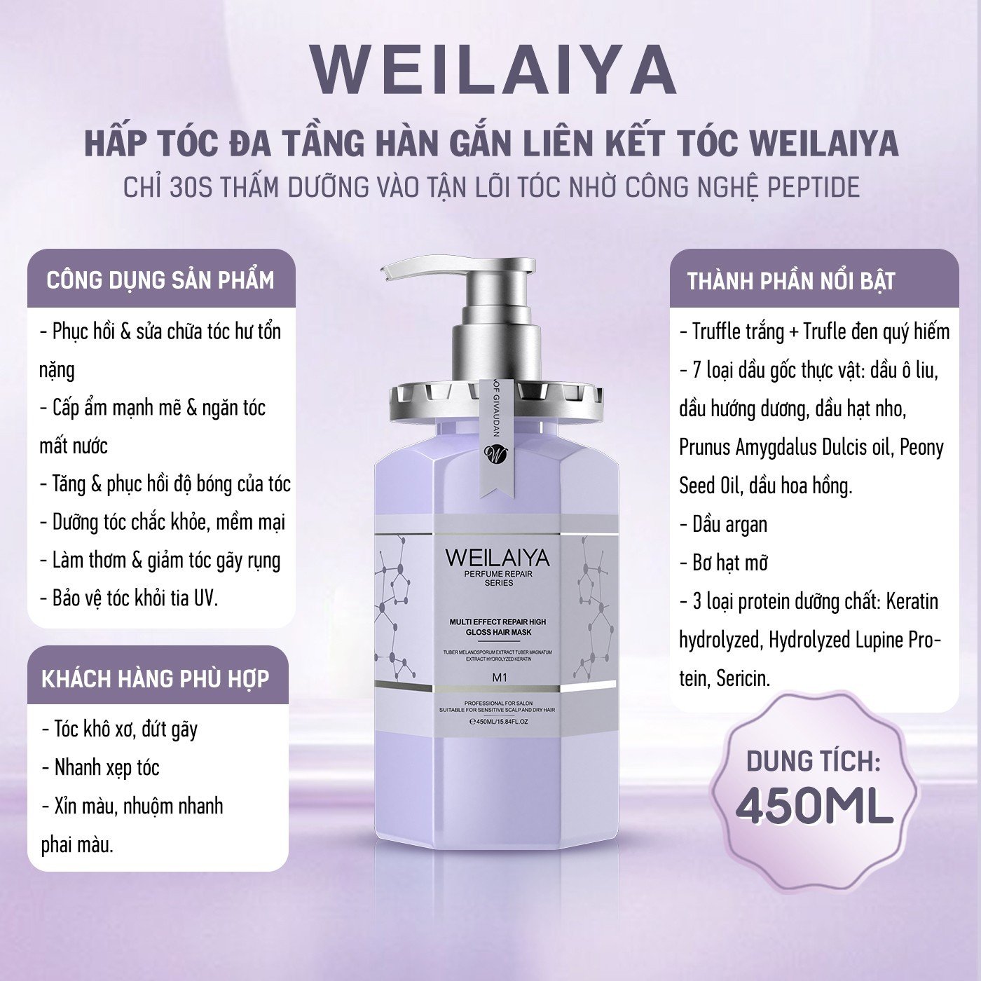 - Mùi hương sang chảnh như nước hoa hàng hiệu, lưu hương 3-4 ngày. Thành phần của Dầu hấp phục hồi liên kết tóc Weilaiya: