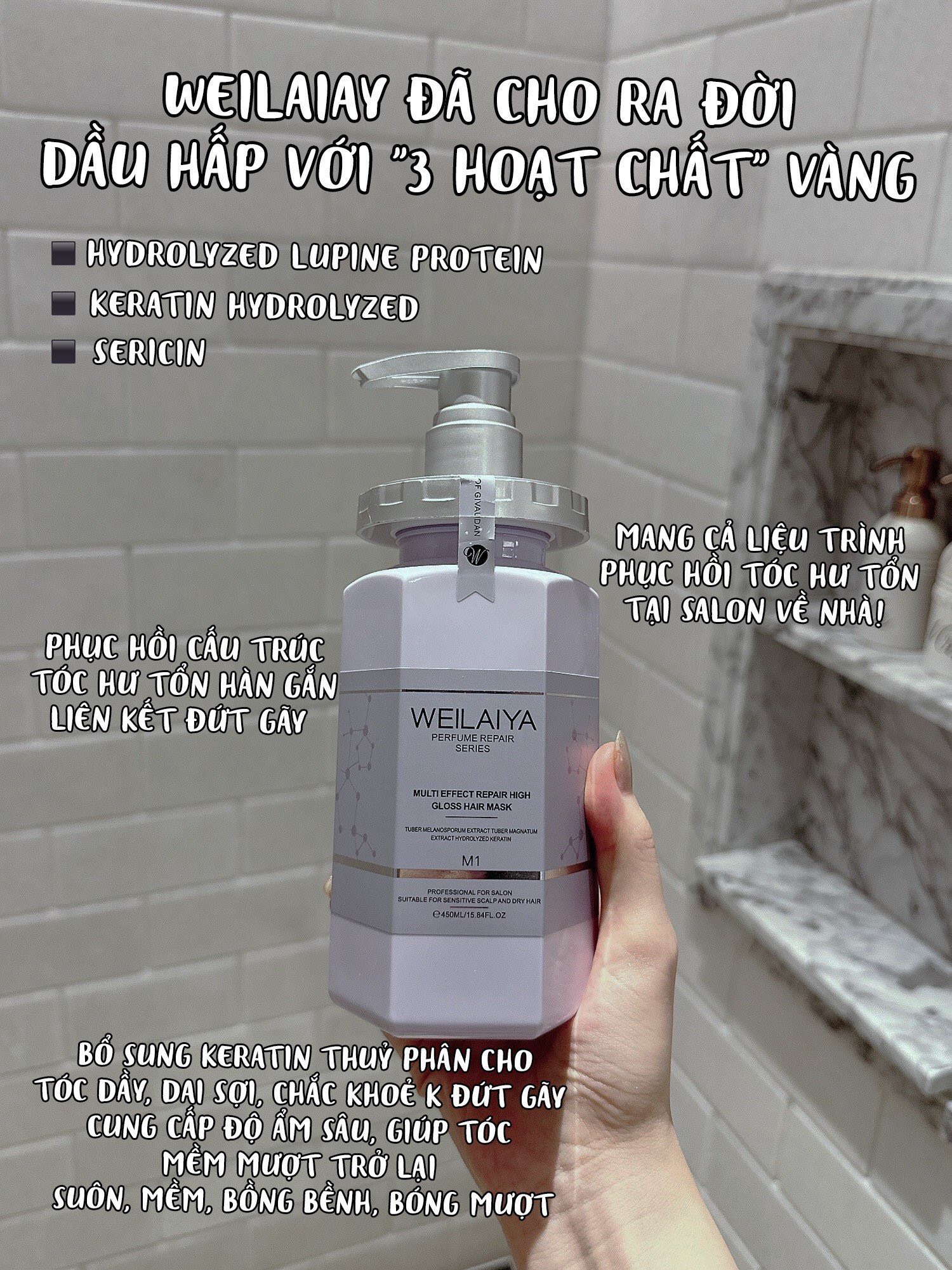 - 7 loại dầu gốc (base oil ) thực vật —Năng lượng tinh túy, rạng ngời tỏa sáng. Ưu điểm của Dầu hấp phục hồi liên kết tóc Weilaiya: Mất ít thời gian hơn và có thể nhanh chóng hấp thụ chỉ trong 30s, làm quá trình 1 lần hấp tóc là 10-15p Dễ dàng gội sạch, không để lại cặn trên tóc, tóc được thông thoáng dễ chịu, vì dầu hấp dạng peptide Mùi hương sang chảnh nước hoa, hương thơm rất trend. Ngày hôm sau, tóc vẫn mềm và bóng, bồng bềnh tự nhiên, k dính bết cảm nhận độ dầy sợi rõ nét. Nhiều thành phần quý hiếm chăm sóc sang trọng dịu nhẹ cho mái tóc như: Gấp đôi Nấm truffle trắng - đen, 8 đầu dưỡng cao cấp... Đo lường hiệu quả của Dầu hấp phục hồi liên kết tóc Weilaiya: 1 lần cảm nhận hiệu quả rõ rệt sau 1 lần sử dụng 21 lần duy trì sử dụng liên tục 21 lần, chất tóc cải thiện rõ rệt +170% sự dẻo dai, chắc khỏe +78% độ mượt +500% độ bóng +89% độ ẩm