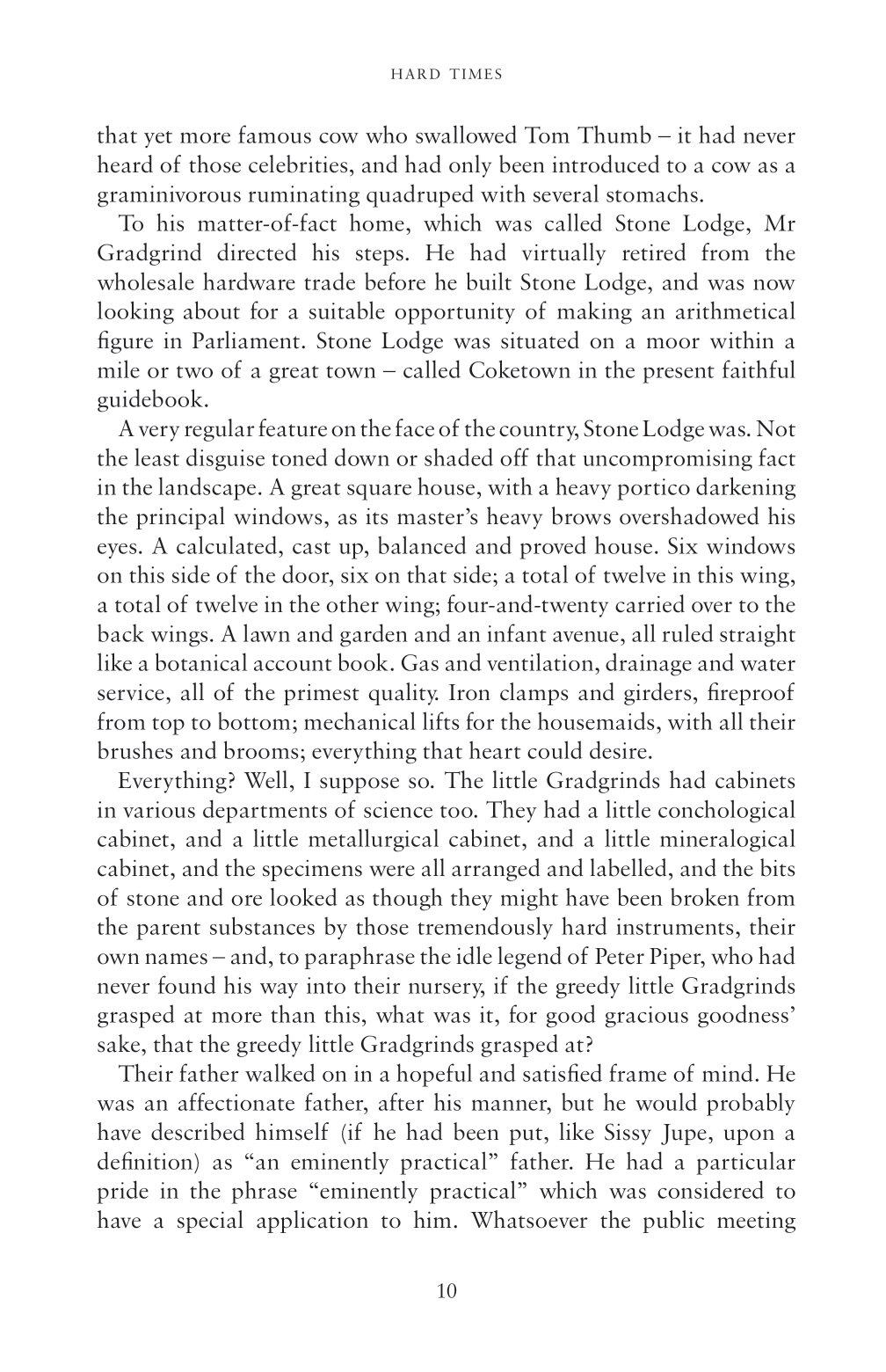 In Hard Times, Dickens illustrates the condition of England through the fictional city of Coketown. Among its inhabitants are Thomas Gradgrind, the utilitarian headmaster who attempts to impose his rigid worldview on his family circle, and the uncaring businessman Mr Bounderby. Their materialist philosophies, as opposed to the world of fancy or imagination, are tested throughout the novel, which also explores workers’ conditions, trade unions and the spurious use of statistics.