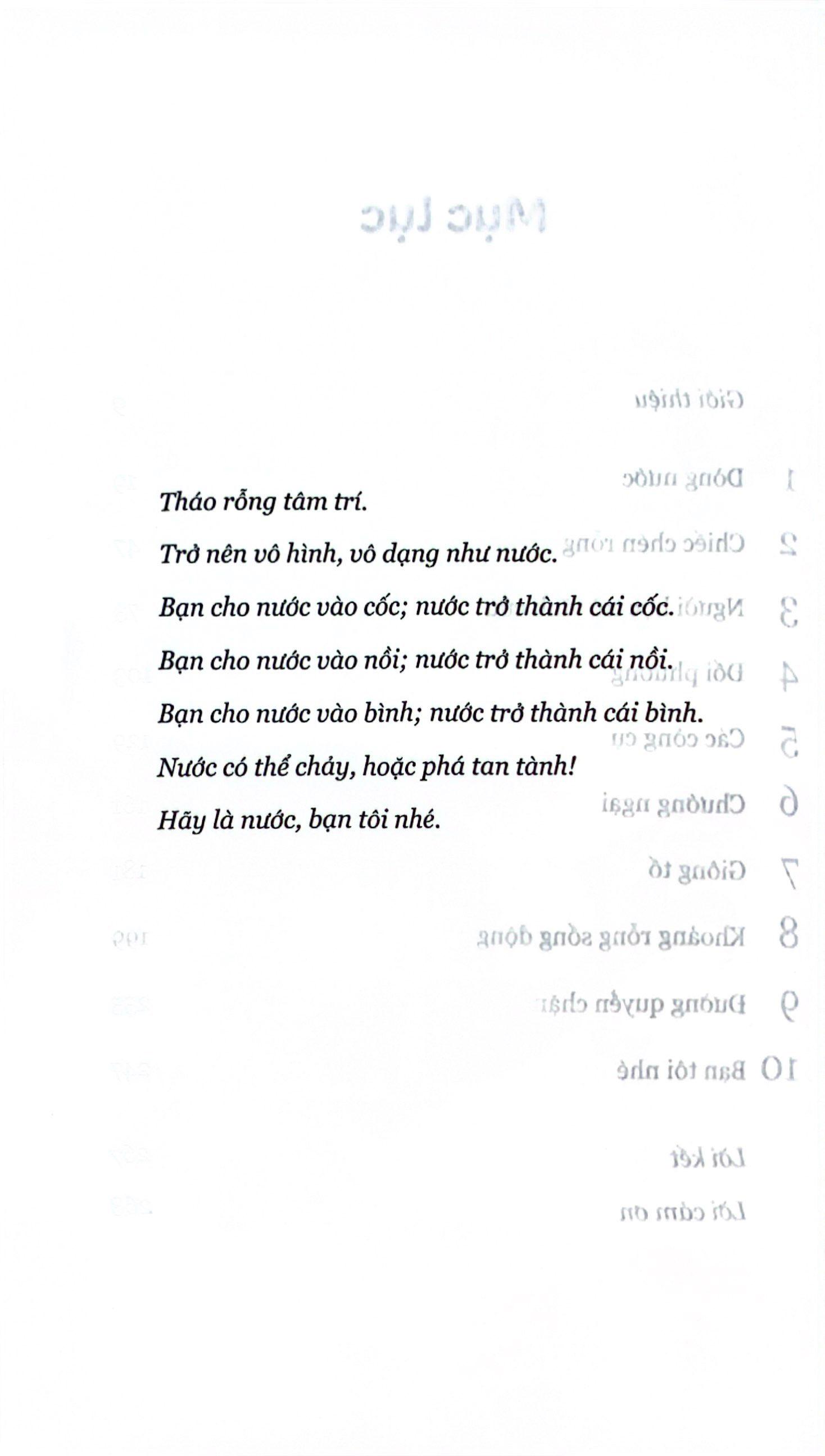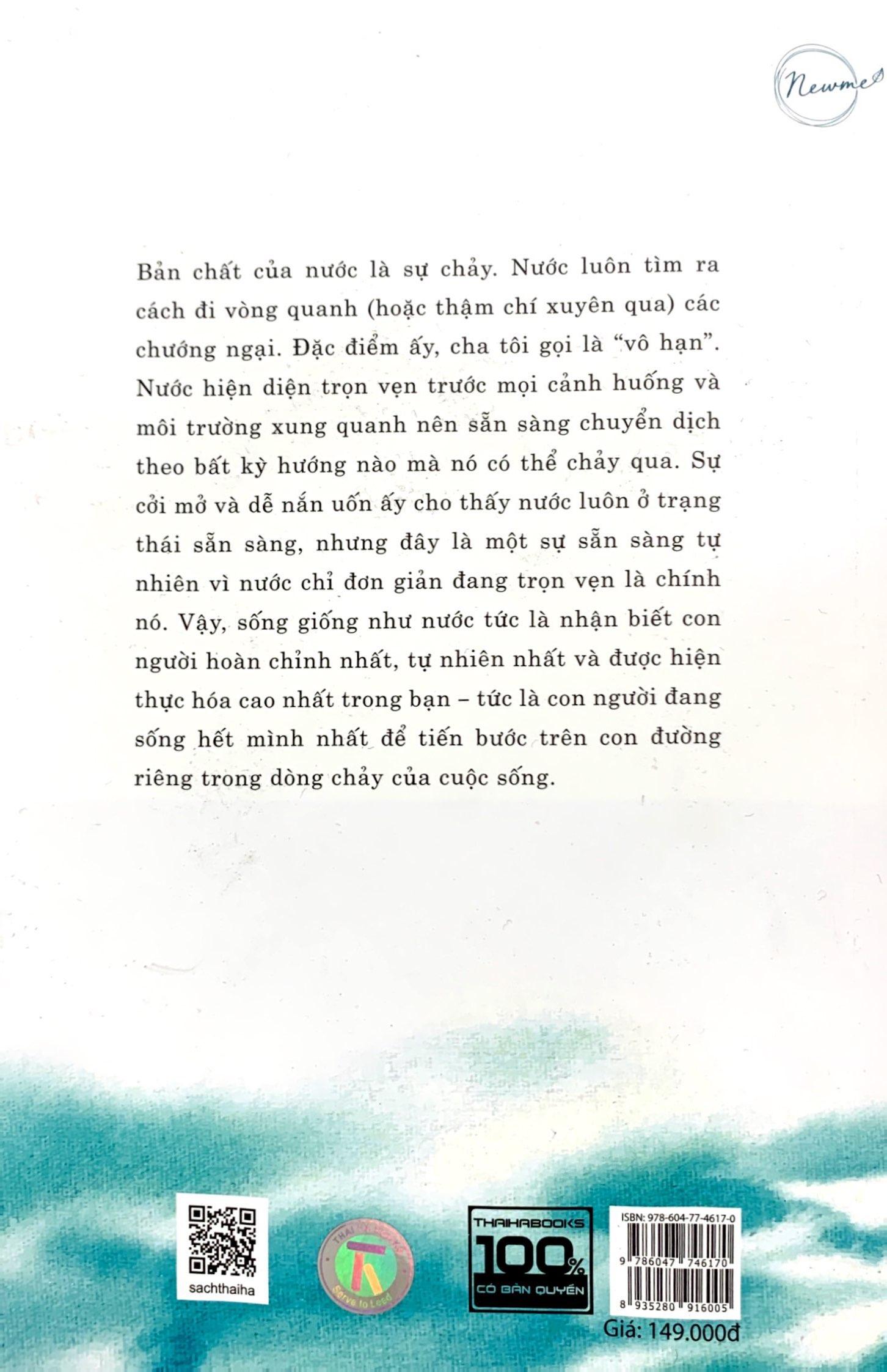 Bản chất của nước là sự chảy. Nước luôn tìm ra cách đi vòng quanh (hoặc thậm chí xuyên qua) các chướng ngại vật. Đặc điểm ấy, cha tôi gọi là “vô hạn”. Nước hiện diện trọn vẹn trước mọi cảnh huống và môi trường xung quanh nên sẵn sàng chuyển dịch theo bất kỳ hướng nào mà nó có thể chảy qua. Sự cởi mở và dễ nắn uốn ấy cho thấy nước luôn ở trạng thái sẵn sàng, nhưng đây là một sự sẵn sàng tự nhiên vì nước chỉ đơn giản đang trọn vẹn là chính nó. Vậy, sống giống như nước tức là nhận biết con người hoàn chỉnh nhất, tự nhiên nhất và được hiện thực hóa cao nhất trong bạn – tức là con người đang sống hết m.ình nhất để tiến bước trên con đường riêng trong dòng chảy của cuộc sống.