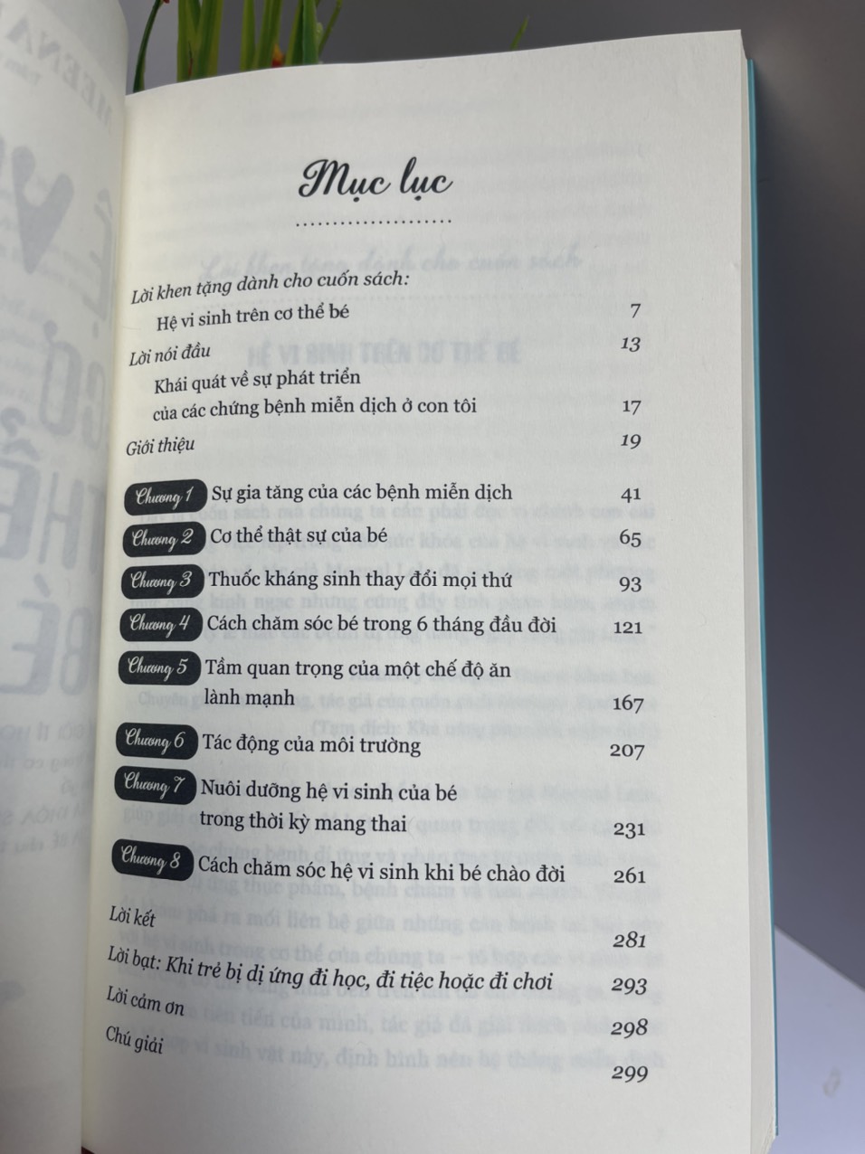 Đây là một tư liệu hướng dẫn hết sức thiết yếu dành cho các bậc cha mẹ về cách chăm sóc trẻ sơ sinh, cách sử dụng kháng sinh, các khuyến nghị về chế độ ăn uống, tác động của môi trường đối với sức khỏe và cách nuôi dưỡng hệ vi sinh của em bé trước và sau khi chào đời. Hệ vi sinh trên cơ thể bé bao gồm các biện pháp phòng ngừa thiết thực như bí quyết tắm cho bé, những việc cần làm khi sinh nở, cách bảo vệ da, giảm tiếp xúc với các độc tố gây ô nhiễm không khí, độc tố trong các chất tẩy rửa và cách bảo vệ hệ vi sinh trong đường ruột thông qua chế độ ăn uống.