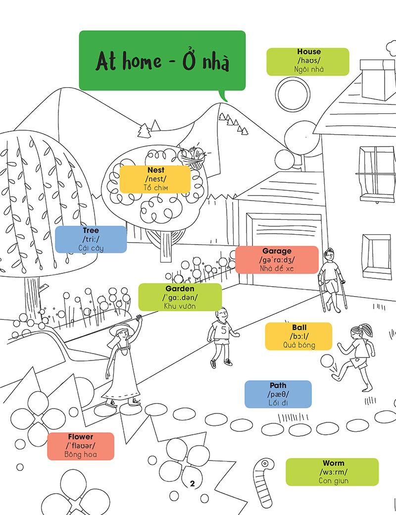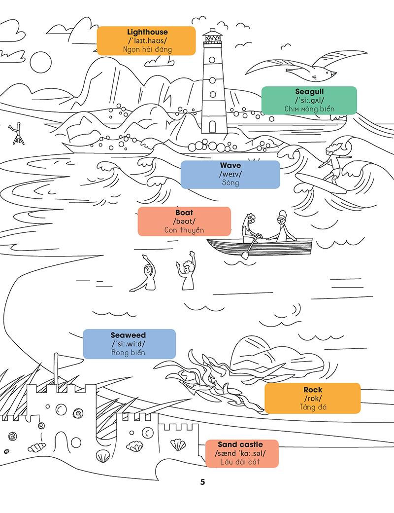 Mua tại TiktokNhững bức tranh sinh động trong cuốn sách này giúp em tập trung vào phần từ mới, trong khi điểm tô thêm màu sắc cho những sự vật trong tranh đấy. Còn gì tuyệt vời hơn khi vừa được trau dồi vốn từ vựng tiếng Anh, vừa được thỏa sức sáng tạo với những màu sắc! Để tìm hiểu thêm về cách phát âm của các từ vựng trong sách, em hãy tham khảo thêm hai cuốn Tiếng Anh cho người mới học và Từ điển tiếng Anh bằng hình cùng bộ nhé!