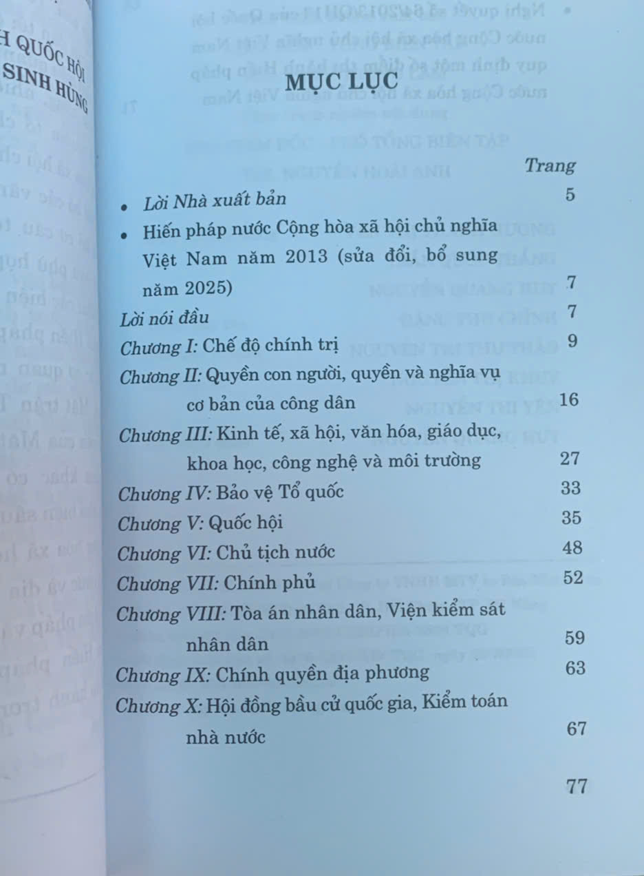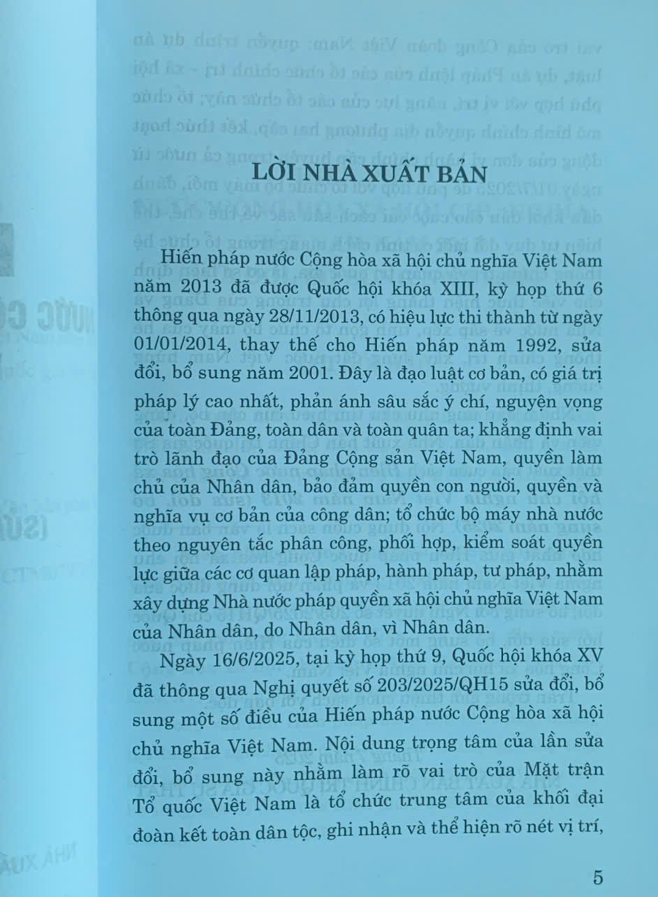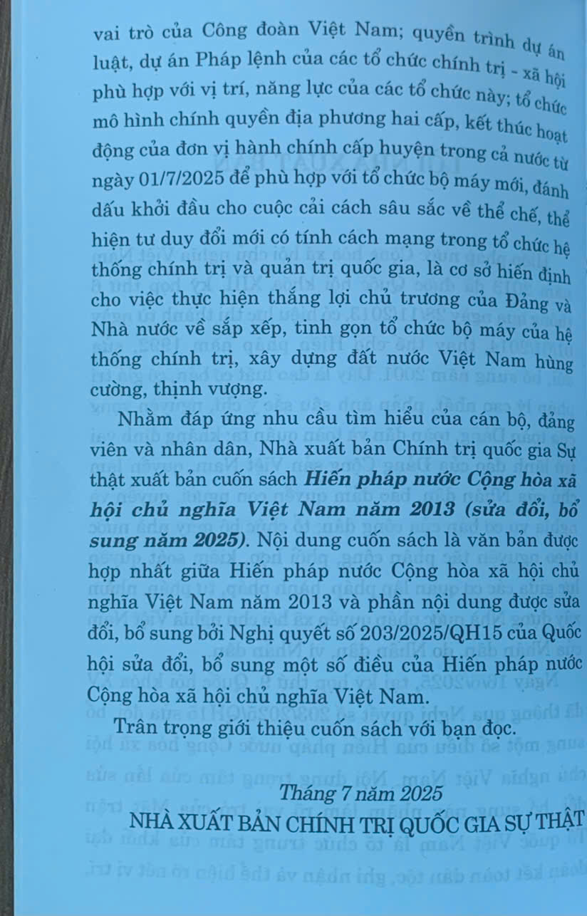 Nhằm đáp ứng nhu cầu tìm hiểu của cán bộ, đảng viên và nhân dân, Nhà xuất bản Chính trị quốc gia Sự thật xuất bản cuốn sách Hiến pháp nước Cộng hòa xã hội chủ nghĩa Việt Nam năm 2013 (sửa đổi, bổ sung năm 2025). Nội dung cuốn sách là văn bản được hợp nhất giữa Hiến pháp nước Cộng hòa xã hội chủ nghĩa Việt Nam năm 2013 và phần nội dung được sửa đổi, bổ sung bởi Nghị quyết số 203/2025/QH15 của Quốc hội sửa đổi, bổ sung một số điều của Hiến pháp nước Cộng hòa xã hội chủ nghĩa Việt Nam.