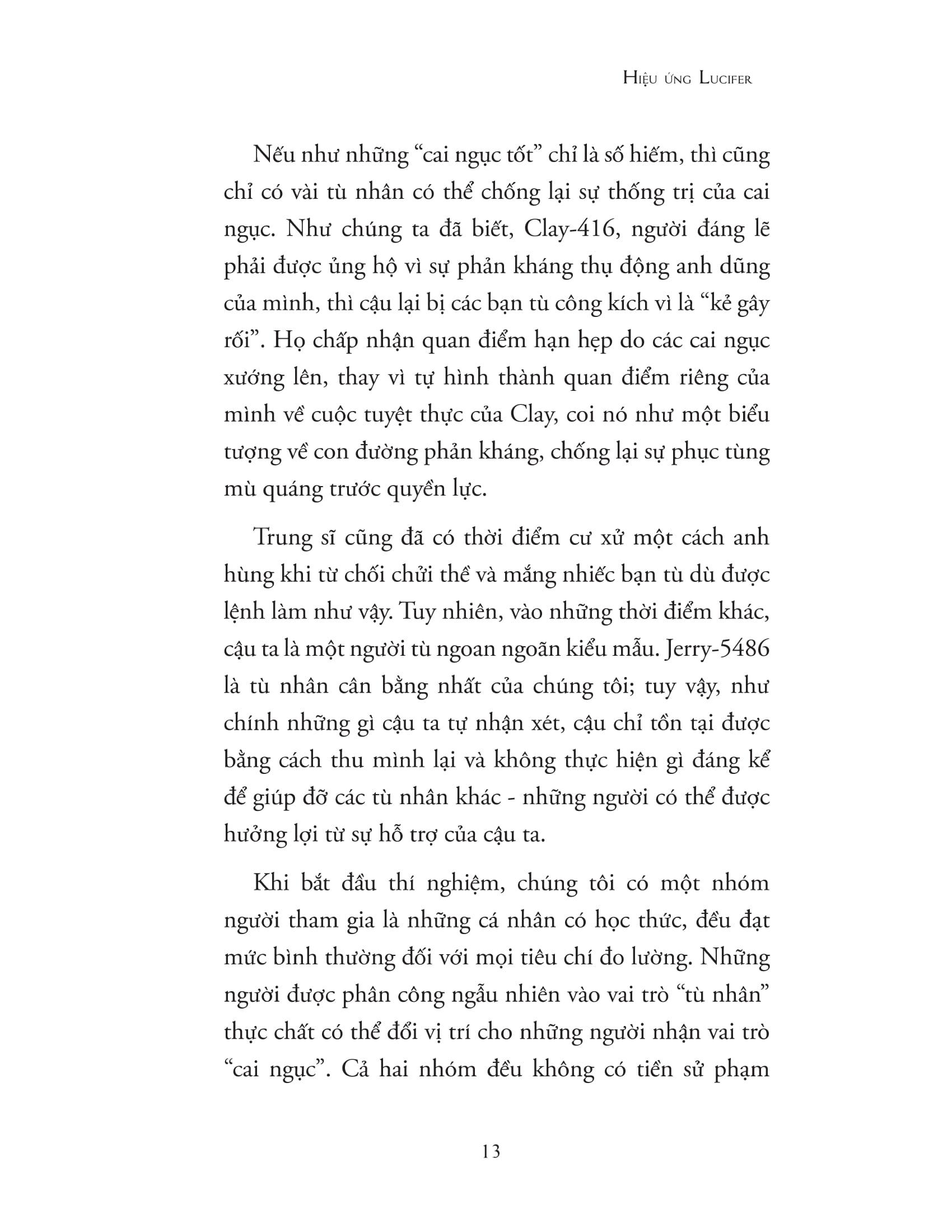 Phần tiếp theo của tập 2 viết về thí nghiệm nhà tù Stanford sẽ kể lại chi tiết tình huống nghiên cứu về sự biến đổi của các sinh viên đại học khi họ được phân công ngẫu nhiên đóng vai tù nhân hoặc cai ngục trong một nhà tù giả. Một trong những kết luận chính từ thí nghiệm nhà tù Stanford là sức mạnh của một loạt biến số hoàn cảnh, dù không biểu hiện rõ ràng nhưng lại có thể chi phối ý chí phản kháng của một cá nhân. Kết luận đó càng được khẳng định hơn trong các chương sách trình bày về hiện tượng này trong các nghiên cứu khoa học xã hội khác. Những người tham gia nghiên cứu - các sinh viên đại học và cả những công dân bình thường - đã thích ứng, tuân thủ, phục tùng và dễ dàng bị dụ dỗ thực hiện những việc mà họ không thể tưởng tượng được là mình sẽ làm khi ở ngoài hoàn cảnh đó. Chúng ta cũng sẽ vượt ra ngoài môi trường thí nghiệm để tìm hiểu về hiệu ứng Lucifer trong thực tế, đặc biệt là câu chuyện về những vụ ngược đãi và tra tấn khủng khiếp các tù nhân tại nhà ngục Abu Ghraib, Iraq. Chúng ta sẽ đào sâu vào địa điểm, con người và hoàn cảnh để đưa ra kết luận về các nguyên nhân dẫn đến những hành vi tàn bạo xuất hiện trong “bộ ảnh chiến tích” mà những người lính đã ghi lại trong quá trình hành hạ tù nhân. Hành trình khắc nghiệt đào sâu đến tận cùng bóng tối sẽ kết thúc trong chương cuối cùng. Khi đó, ta tìm hiểu một số thông tin tích cực về bản chất con người, về những gì mà mỗi cá nhân chúng ta có thể làm để đương đầu với sức mạnh của hoàn cảnh và hệ thống. Trong tất cả những nghiên cứu và các ví dụ thực tế, luôn có một số cá nhân phản kháng và không chịu khuất phục trước cám dỗ. Thứ giúp họ thoát khỏi cái ác không phải là bản tính thiện lành bẩm sinh, mà thường là do sự hiểu biết của họ (dẫu còn khá bản năng) về các chiến thuật phản kháng về mặt tinh thần và xã hội. Cuốn sách cung cấp một số chiến thuật có thể giúp mọi người chống lại những ảnh hưởng xã hội không mong muốn - những giải pháp này dựa trên sự kết hợp giữa kinh nghiệm của tác giả cùng các cộng sự trong chuyên ngành tâm lý xã hội, hay những chuyên gia về ảnh hưởng và thuyết phục. Khi hầu hết mọi người đều chịu khuất phục và chỉ một số ít dám đứng lên, những người bất tuân có thể được coi là anh hùng. Hành trình của cuốn sách này sẽ kết thúc bằng sự tích cực khi tôn vinh bản chất anh hùng tồn tại trong mỗi chúng ta. Trái ngược với “sự tầm thường của cái ác”, lý thuyết cho rằng những người bình thường đều có thể suy đồi và trở nên tàn ác, tác giả Zimbardo đặt ra thuật ngữ “sự tầm thường của chủ nghĩa anh hùng” để tôn vinh mọi người đàn ông và phụ nữ đã tuân theo lời thúc giục đấu tranh vì nhân loại khi đến thời điểm buộc phải hành động. Khi lời kêu gọi đó vang lên, họ biết rằng nó là dành cho mình. Lời thúc giục ấy kêu gọi chúng ta hãy đề cao những phần tốt đẹp nhất trong bản chất con người, vượt lên trên những áp lực mạnh mẽ của hoàn cảnh và hệ thống như một lời khẳng định rằng, phẩm giá con người đủ khả năng để chống lại cái ác. Về tác giả Philip Zimbardo được quốc tế công nhận là “gương mặt đại diện cho tâm lý học đương đại”. Nghiên cứu kinh điển của ông - thí nghiệm nhà tù Stanford - vẫn còn nguyên giá trị tham khảo sau hàng thập kỷ, không ngừng khiến công chúng ngỡ ngàng về sự biến đổi tính cách của con người dưới sự tác động của những yếu tố hoàn cảnh và hệ thống đầy uy lực. Zimbardo là giáo sư của Đại học Stanford từ năm 1968, trước đó từng giảng dạy tại các trường Yale, New York và Columbia. Ông được trao nhiều giải thưởng và danh hiệu vì những cống hiến cho ngành tâm lý học. Những đề tài nghiên cứu ông đặc biệt quan tâm là ý thức về thời gian, sự thuyết phục, sự điên rồ, sự bạo lực, tâm lý chính trị, chủ nghĩa khủng bố và chủ nghĩa anh hùng. Một số lời khen “Hiệu ứng Lucifer sẽ vĩnh viễn thay đổi cách bạn suy nghĩ về lý do khiến chúng ta hành xử theo những cách nhất định, và đặc biệt thay đổi cách bạn suy nghĩ về khả năng gây tội ác của một con người. Đây là một cuốn sách làm ta khó chịu, nhưng cực kỳ cần thiết.” - Malcolm Gladwell “Một cuốn sách quan trọ Tất cả các chính trị gia và nhà bình luận xã hộ đều nên đọc tác phẩm này.” - The Times (London). “Rất chuyên sâ Zimbardo kết hợp một nghiên cứu tâm lý xã hội dày đặc thông tin, đầy thu hút với tinh thần đạo đức chính trực, qua đó thách thức độc giả nhìn xa hơn những lời lên án hời hợt để suy ngẫm về trách nhiệm tập thể của chúng ta đối với những tệ nạn trên thế giới này.” - Publishers Weekly.