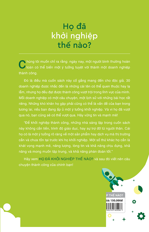 Đó là điều mà Họ đã khởi nghiệp thế nào? cố gắng mang đến cho độc giả. 30 doanh nghiệp được nhắc đến là những cái tên có thể quen thuộc hay lạ lẫm, nhưng họ đều đạt được những thành công vượt trội trong lĩnh vực của mình. Mỗi doanh nghiệp có một câu chuyện, một lịch sử với những bài học rất riêng. Những khó khăn họ gặp phải cũng có thể là vấn đề của bạn trong tương lai, nếu bạn đang ấp ủ một ý tưởng khởi nghiệp. Và vì họ đã vượt qua nó, bạn cũng có thể sẽ vượt qua. Hãy vững tin và mạnh mẽ!