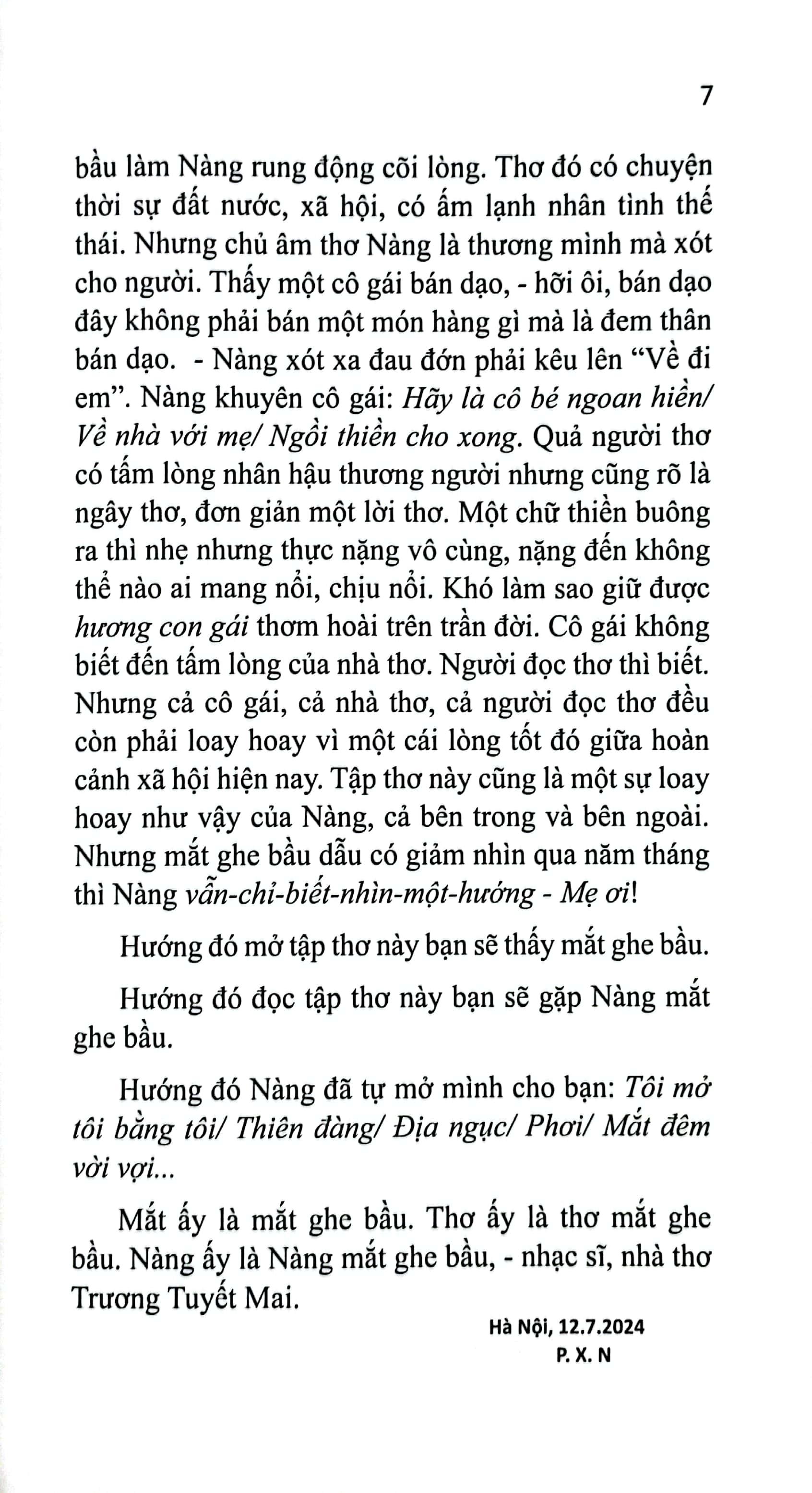 Tập thơ Hòa Âm Đêmnhân dịp sinh nhật lần thứ 80 và đón nhận Giải thưởng Nhà nước về Văn học nghệ thuật năm 2023. Trương Tuyết Mai được xem là cánh chim đầu đàn trong những nữ nhạc sĩ Việt Nam với gia tài âm nhạc đồ sộ gồm hơn 400 bài hát và hợp xướng, trong đó có những ca khúc quen thuộc được đông đảo công chúng nhiều thế hệ yêu mến như “Xe ơi ta lên đường” (phỏng thơ Huy Cận), Huế – tình yêu của tôi (phổ thơ Đỗ Thị Thanh Bình), Sao anh không là, Từ ngày ấy, Rừng với tình em,... Sinh năm 1944 tại Hải Phòng, nguyên quán ở Sông Cầu, Phú Yên; nhạc sĩ Trương Tuyết Mai bắt đầu hoạt động âm nhạc từ các trường học sinh miền Nam ở Hải Phòng. Năm 1965, bà tốt nghiệp môn sáo flute ở Trường Âm nhạc Việt Nam, về công tác tại Dàn nhạc Đài Phát thanh Giải phóng. Từ năm 1974, bà phục vụ tại chiến trường Trị-Thiên và Khu V trong Đoàn ca nhạc Đài Phát thanh Giải phóng, rồi chuyển về làm việc tại dàn nhạc Đài Tiếng nói VN. Từ năm 1981, nhạc sĩ Trương Tuyết Mai làm công tác biên tập âm nhạc tại Đài Tiếng nói nhân dân TPHCM cho đến khi nghỉ hưu. Hơn nửa thế kỷ hoạt động nghệ thuật, bên cạnh thế mạnh về âm nhạc cùng nhiều tuyển tập ca khúc đã phát hành thì ít ai biết rằng Trương Tuyết Mai còn là tác giả thơ và văn xuôi, hiện là hội viên Hội Nhà văn TPHCM. Hòa Âm Đêm là tập thơ thứ 7 sau các tập thơ mà Trương Tuyết Mai đã ra mắt từ trước như: Một nửa cho anh (2006), Lá vỡ (2008), Nghe trăng (2009), Gọi thầm (2013), Mắc cạn (2018), Gập ghềnh khúc đau (2020) cùng với 1 tập hồi ký “Lật từng mảnh ghép” (2014)...