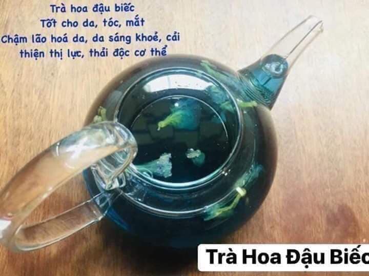 Công dụng: Hoa đậu biếc ngoài công dụng là thực phẩm, trong đông y hoa đậu biếc còn có rất nhiều tác dụng khác trong làm thuốc, giàu chất chống oxy hóa mạnh, rất tốt cho da, tóc và mắt. Làm chậm quá trình lão hóa, giữ da sáng khỏe, tăng cường hệ thống miễn dịch, kích thích sự lưu thông máu và giúp thải độc toàn cơ thể. Các chất chống oxy hóa proanthocyanidin giúp cải thiện dòng chảy của máu qua các mao mạch của mắt, giúp mắt điều chỉnh nhanh hơn với những thay đổi trong ánh sáng và cải thiện độ sắc nét của thị lực, sử dụng hoa đậu biếc trong nhiều năm sẽ cải thiện lưu thông máu đến đầu, giảm nguy cơ ung thư, tránh rụng và bạc tóc, ngăn chặn tóc hoa râm. Ngoài ra hoa đậu biếc rất tốt cho việc làm đẹp, nấu ăn, thải độc tố cơ thể, nhuận tràng, kích thích tiêu hoá, hỗ trợ làm giảm viêm phổi, ho. Nấu nước hoa đậu biếc uống có thể giảm đau do viêm họng hoặc có thể dùng để rửa vết thương, giảm phù nề và ngăn mưng mủ.