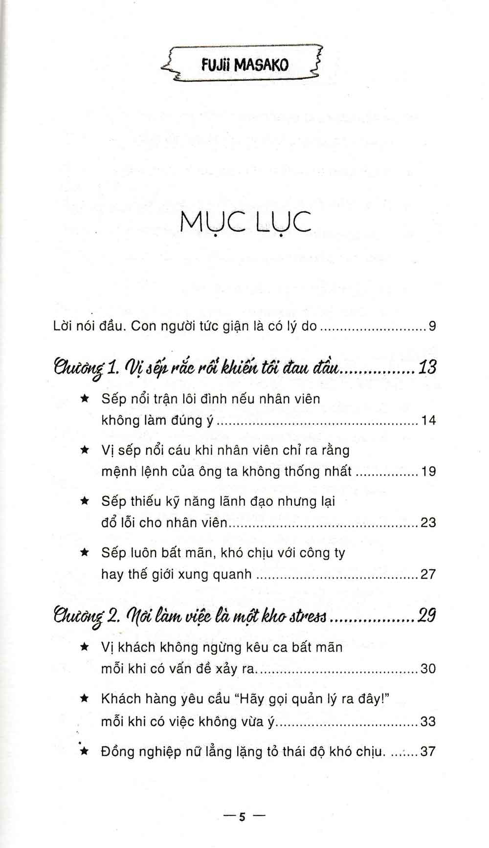 - Những phiền phức trong cuộc sống thường nhật Mỗi ngày một người bình thường dường như phải đối mặt với rất nhiều những cơn giận dữ từ nhiều nguồn khác nhau. Rất may trong cuốn sách này, bác sĩ tâm lý Fujii Masako sẽ chỉ ra cho độc giả cách thức hóa giải những giận dữ mà bạn có thể phải đối mặt. Tác giả Fujii Masako cho biết có vô số lý do khiến một người trở nên giận dữ, tuy nhiên có một điểm chung duy nhất, đó là người tức giận đang gặp phải khó khăn, và chính vì không xử lý được vấn đề nên họ chỉ còn cách thể hiện bằng sự tức giận. Do đó, từ nay nếu gặp ai đó đang giận dữ, bạn hãy tự nhủ rằng họ đang gặp khó khăn. “Tôi là tôi. Bạn là bạn”. Nếu chúng ta có thể phân biệt rạch ròi ranh giới giữa bản thân và người khác thì việc chúng ta bị cảm xúc của họ chi phối, hoặc trút giận lên người khác chắc chắn sẽ giảm đáng kể. Nếu vẫn quá để tâm đến chuyện đó thì tốt hơn hết, bạn hãy xem xem liệu mình có thể giúp họ điều gì không. Ẩn chứa phía sau cơn giận dữ là vô vàn các nguyên do, và đó chính là điều mà tác giả cuốn sách cung cấp cho độc giả trong cuốn sách này. Hy vọng rằng khi phải đối mặt với sự tức giận của ai đó, bạn có thể đối phó một cách khéo léo và hiệu quả .