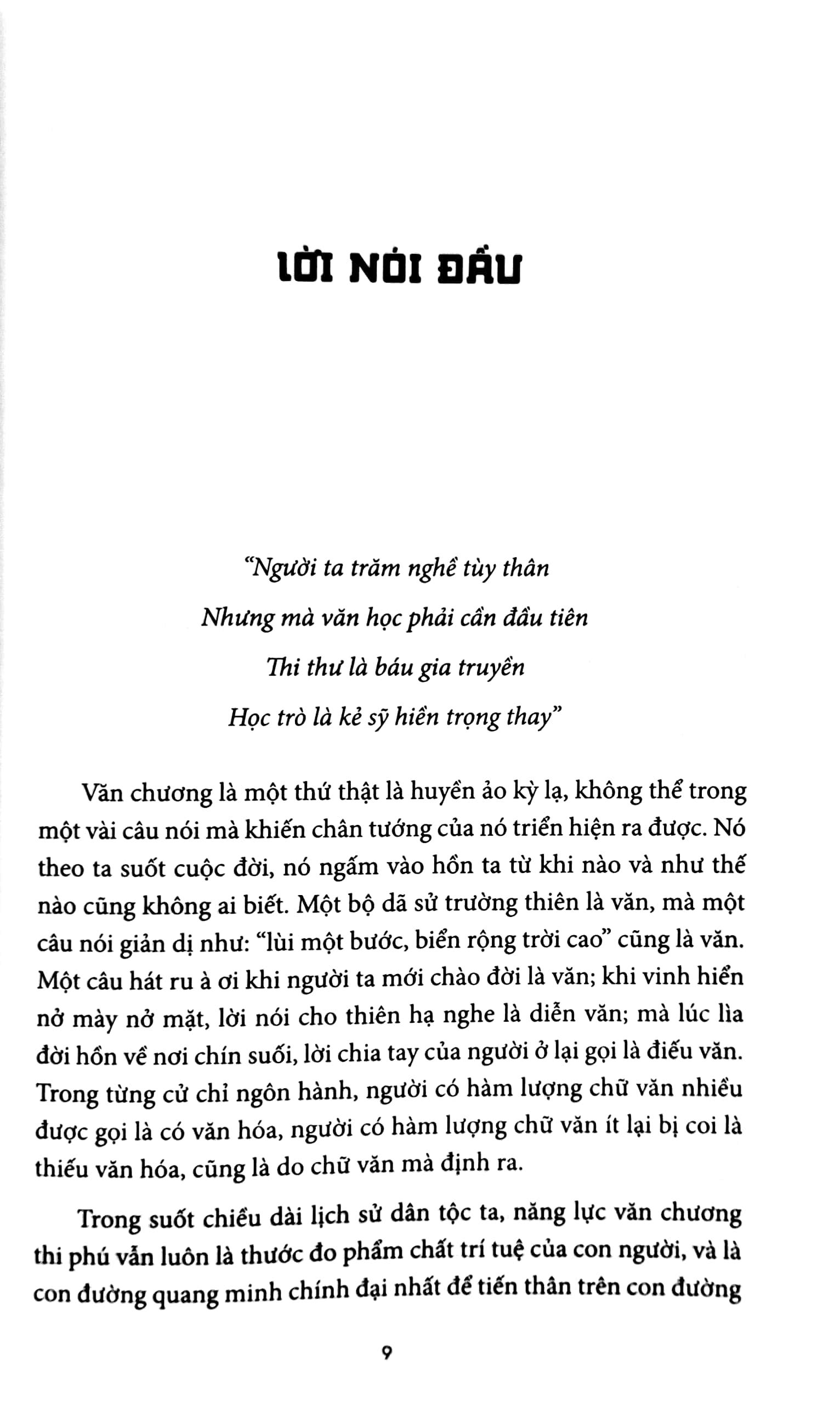 Trong suốt chiều dài lịch sử dân tộc ta, năng lực văn chương thi phú vẫn luôn là thước đo phẩm chất trí tuệ của con người, và là con đường quang minh chính đại nhất để tiến thân trên con đường quan lộ, vinh hoa phú quý. Thế nhưng mới chỉ vài chục năm trở lại đây, văn chương thi phú bị xem như một môn học phù phiếm, không có mấy ai đặt công phu để học hành một cách nghiêm túc và nó dường như không phải là điều cốt yếu quyết định sự thành danh của người ta. Ngày nay những người ở nơi chức trọng quyền môn không nhất định là giỏi môn văn và không nhất định có nhiều hàm lượng chữ văn trong từng lời ăn tiếng nói của họ. Quả là thực hư lẫn lộn.