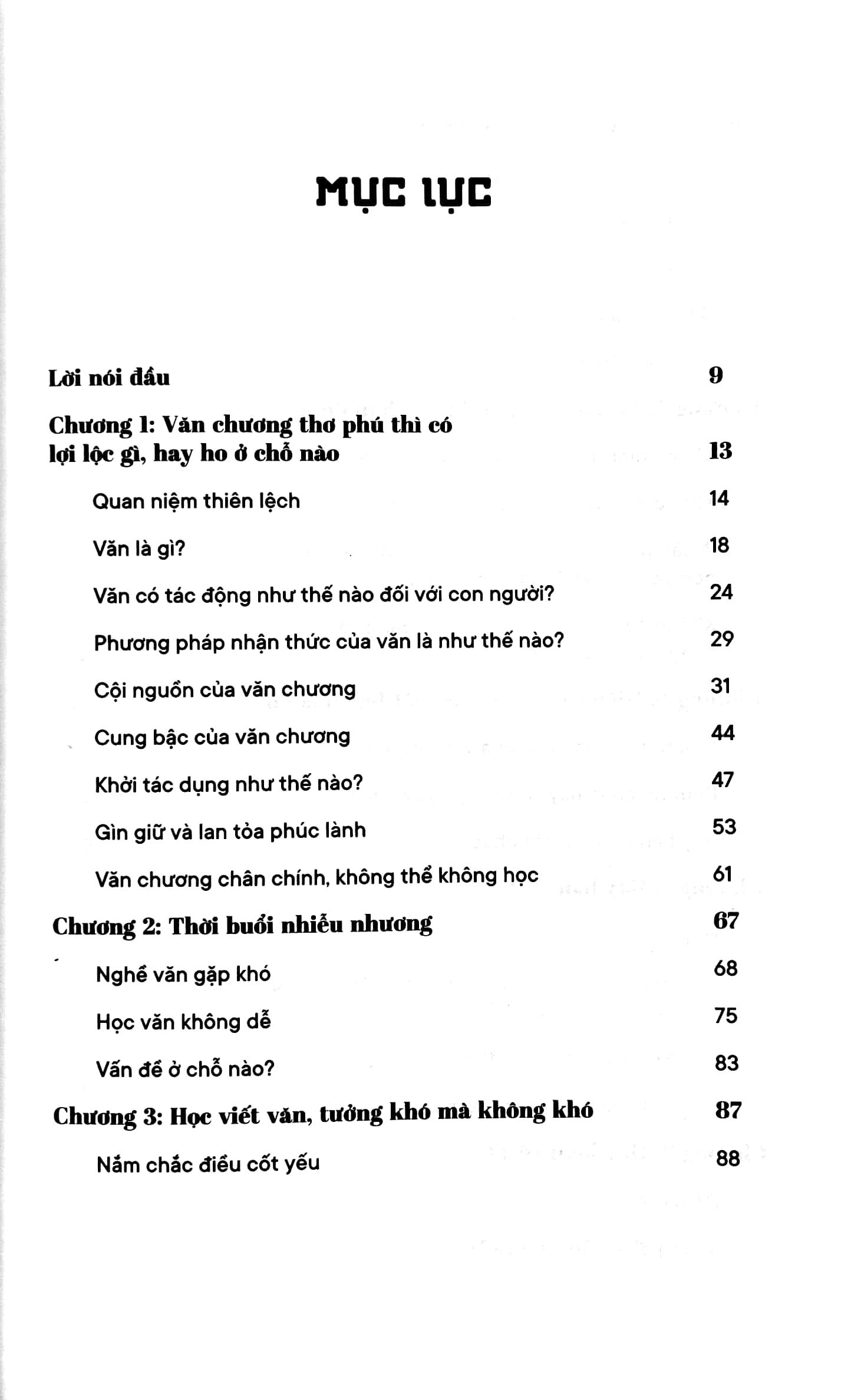 Nếu vậy không có văn thì đã làm sao? Không có văn thì người thông minh được gọi là ranh mãnh, tệ hơn nữa thì gọi là lưu manh; người giàu thì chỉ được gọi là phú ông thôi; phú ông mà không có văn thì không thể trở thành quý nhân để người đời kính nể được; những món đồ dùng trang phục đắt tiền không làm nên sự tôn quý của con người. Những thứ được gọi là thô thiển tầm phào cũng là bởi vì không có văn. Con người mà không có văn thì hành vi cẩu thả bừa bãi; gia đình không có văn thì nền nếp tuềnh toàng, ngôn từ suồng sã; quốc gia mà không có văn thì cảnh trí xác xơ, tiền đồ vô vọng. Vậy rốt cuộc văn chương là gì và làm sao có thể học và viết văn hay cho được? Có ý kiến cho rằng: “Học văn sao mà khó quá. Bây giờ học môn văn mà viết ra suy nghĩ lý luận thật từ trong tâm m.ình thì không được điểm cao. Mà muốn được điểm cao chỉ có một cách: học thuộc lòng bài văn mẫu. Nếu vậy thì đó là môn học thuộc lòng rồi, đâu phải môn văn.”