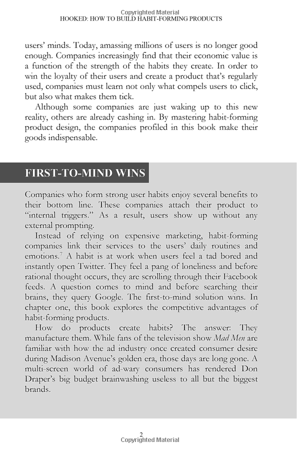 Eyal provides readers with practical insights to create user habits that stick; actionable steps for building products people love; and riveting examples from the iPhone to Twitter, Pinterest and the Bible App.