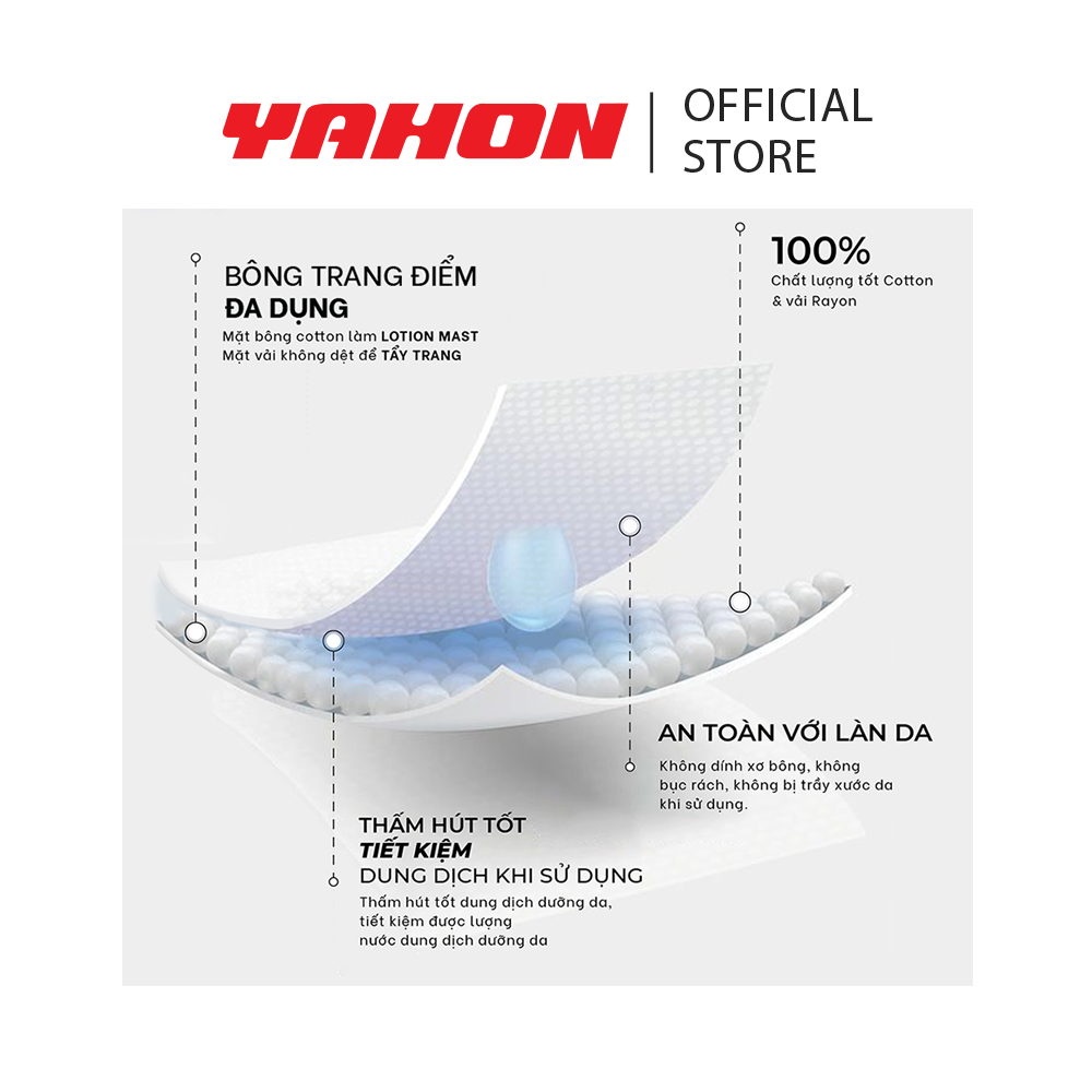 Sản phẩm có thiết kế 2 mặt, với công dụng :Một mặt bằng vải không dệt Rayon phẳng trơn mịn dùng để các sản phẩm dưỡng da, trang điểm.Một mặt bằng vải không dệt Rayon lỗ dùng để tẩy trang, tẩy tế bào chết