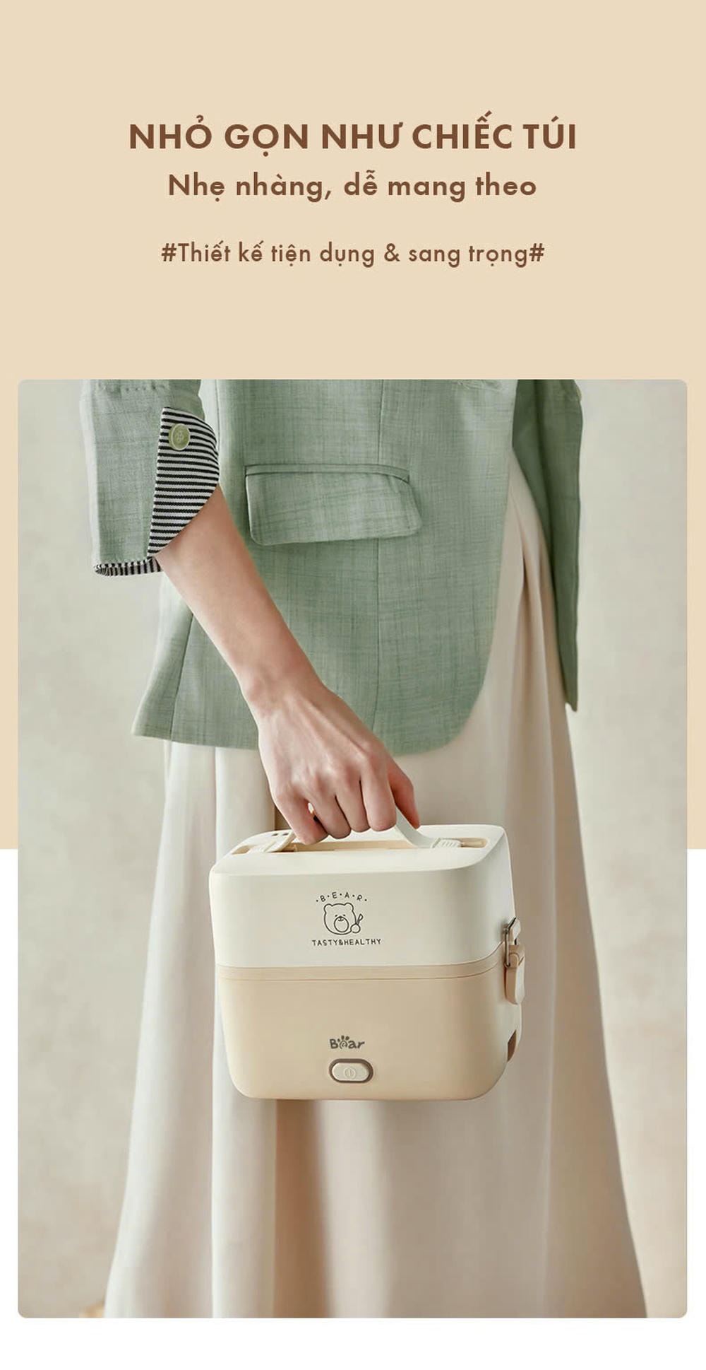 Thiết kế nhỏ gọn, thời trang Kích thước chỉ 175x130x158mm, nhẹ nhàng, dễ mang theo với quai xách silicone mềm mại. Kiểu dáng hiện đại, màu sắc trang nhã như một món phụ kiện cầm