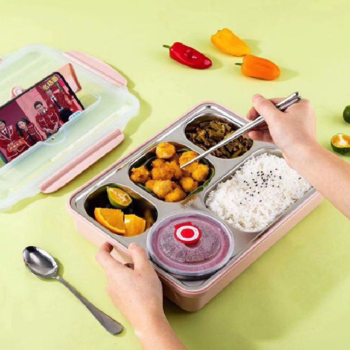 • -Hộp có chia ngăn, bạn có thể để riêng thức ăn và cơm mỗi loại 1 ngăn. Đặc Biệt có ngăn chứa canh , giá đỡ điện thoại vừa giải trí vừa thưởng thức bữa ăn ngon