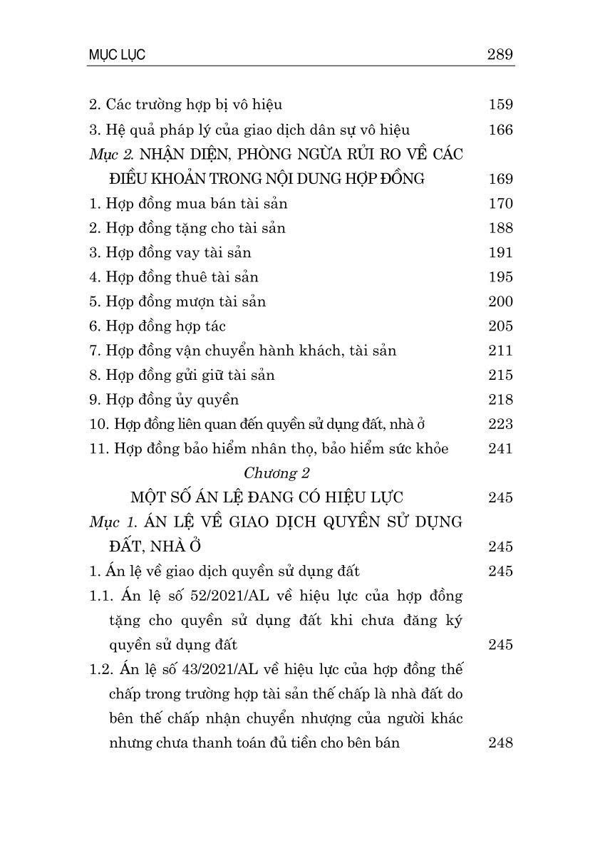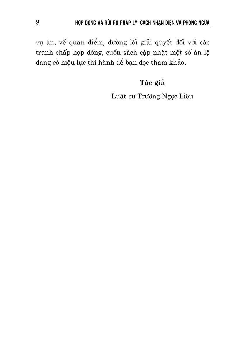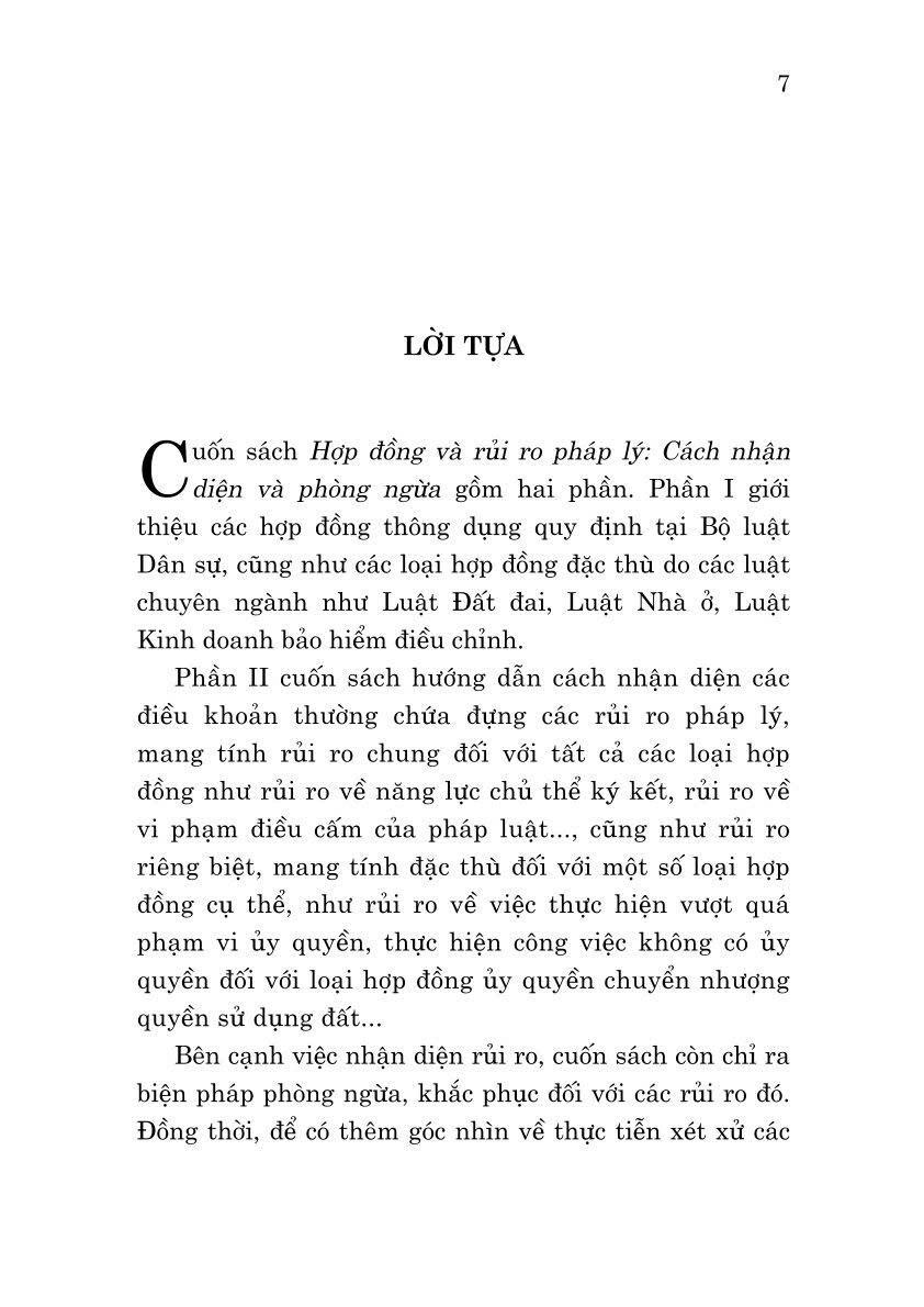Nhằm giúp bạn đọc có được các thông tin hữu ích về vấn đề trên, Nhà xuất bản Chính trị quốc gia Sự thật xuất bản cuốn sách Hợp đồng và rủi ro pháp lý: Cách nhận diện và phòng ngừa, do Luật sư Trương Ngọc Liêu biên soạn. Cuốn sách trình bày những quy định về các loại hợp đồng thông dụng (hợp đồng mua bán, tặng cho, vay mượn, ủy quyền tài sản,...), các loại hợp đồng đặc thù (hợp đồng liên quan đến bất động sản, bảo hiểm); phân tích và làm rõ những rủi ro phát sinh thường gặp, đưa ra một số biện pháp kiểm soát, phòng ngừa rủi ro khi soạn thảo, ký kết hợp đồng.