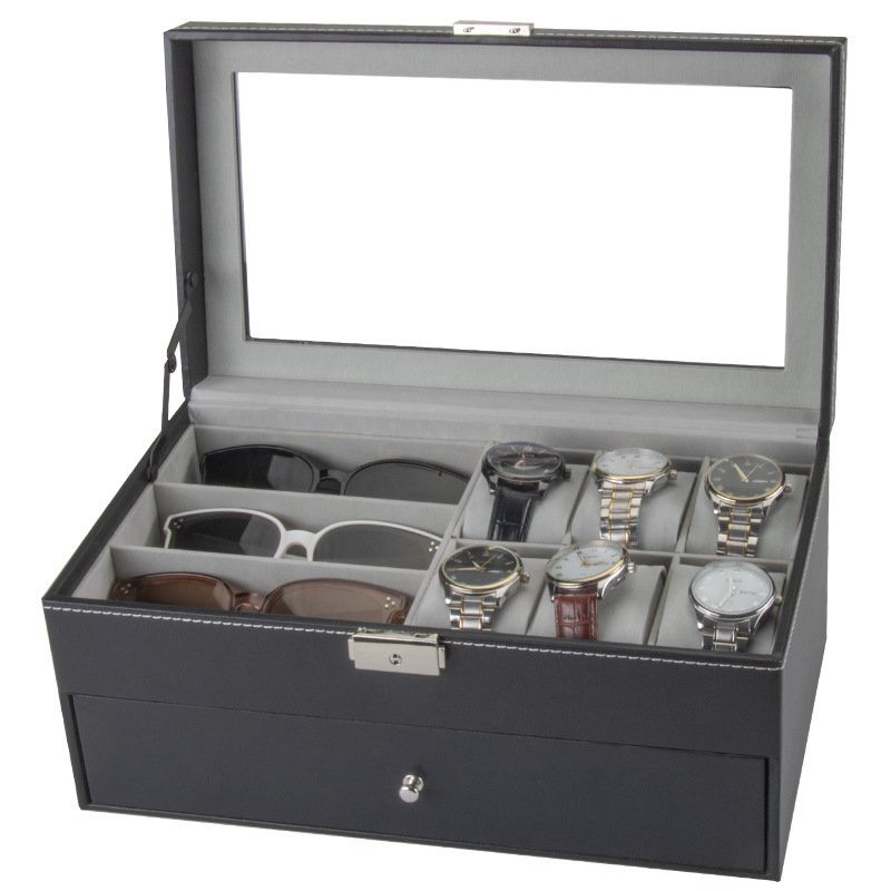 ✨Hộp Đựng Đồng Hồ Và Mắt Kính 2 Tầng SAIKE SAIKE S609 Vỏ Da Màu Đen