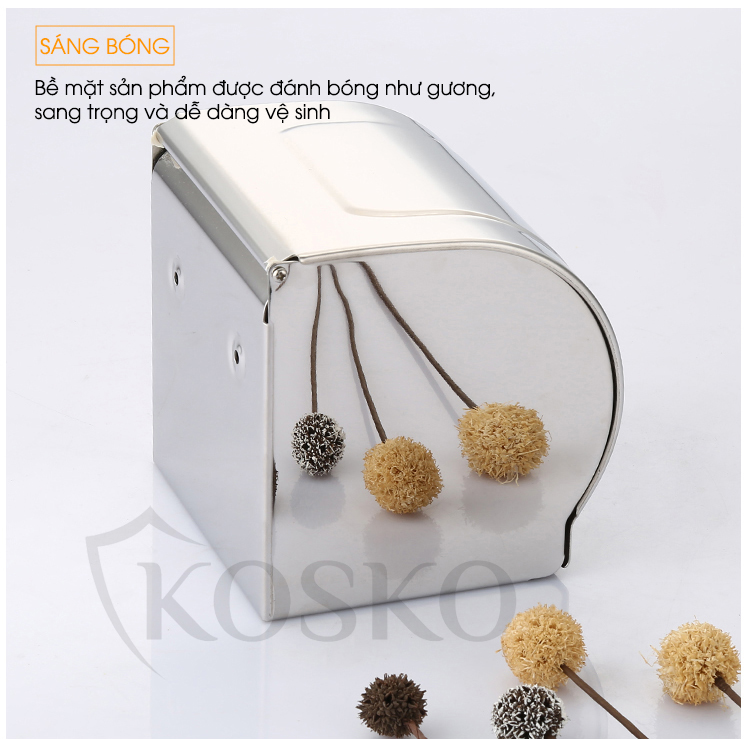 Sản phẩm: Hộp đựng giấy vệ sinh KOSKO, giấy vệ sinh treo tường. Chất liệu hộp đựng giấy inox 304, không gỉ luôn sáng bóng trong môi trường có độ ẩm cao. Thiết kế hộp giấy có đáy và nắp đậy giữ cho những cuộn giấy không bám bụi bẩn hay thấm nước. Sản phẩm có kích thước 12.5x12x12cm phù hợp với các cuộn giấy thông thường. Không chỉ hữu ích sản phẩm còn góp phần tạo nên tính thẩm mỹ chung cho không gian phòng tắm của gia đình. Bộ sản phẩm gồm: 1 lô giấy, 2 đinh vít với cách lắp đặt đơn giản, bạn hoàn toàn có thể tự thao tác mà không cần gọi thợ. Điểm đặc biệt là sản phẩm có thể dùng được với nhiều loại cuộn giấy.