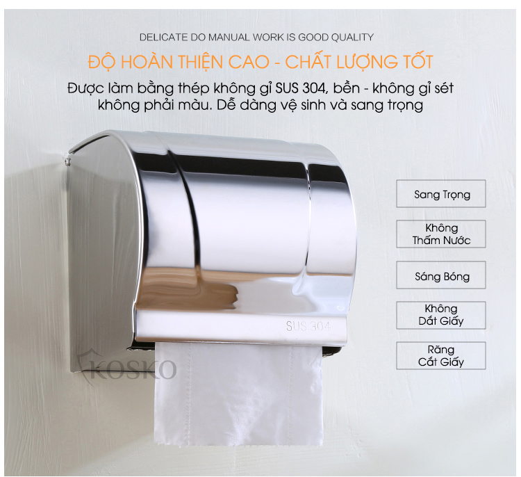 Sản phẩm: Hộp đựng giấy vệ sinh KOSKO, giấy vệ sinh treo tường.Chất liệu hộp đựng giấy inox 304, không gỉ luôn sáng bóng trong môi trường có độ ẩm cao.Thiết kế hộp giấy có đáy và nắp đậy giữ cho nhữ...