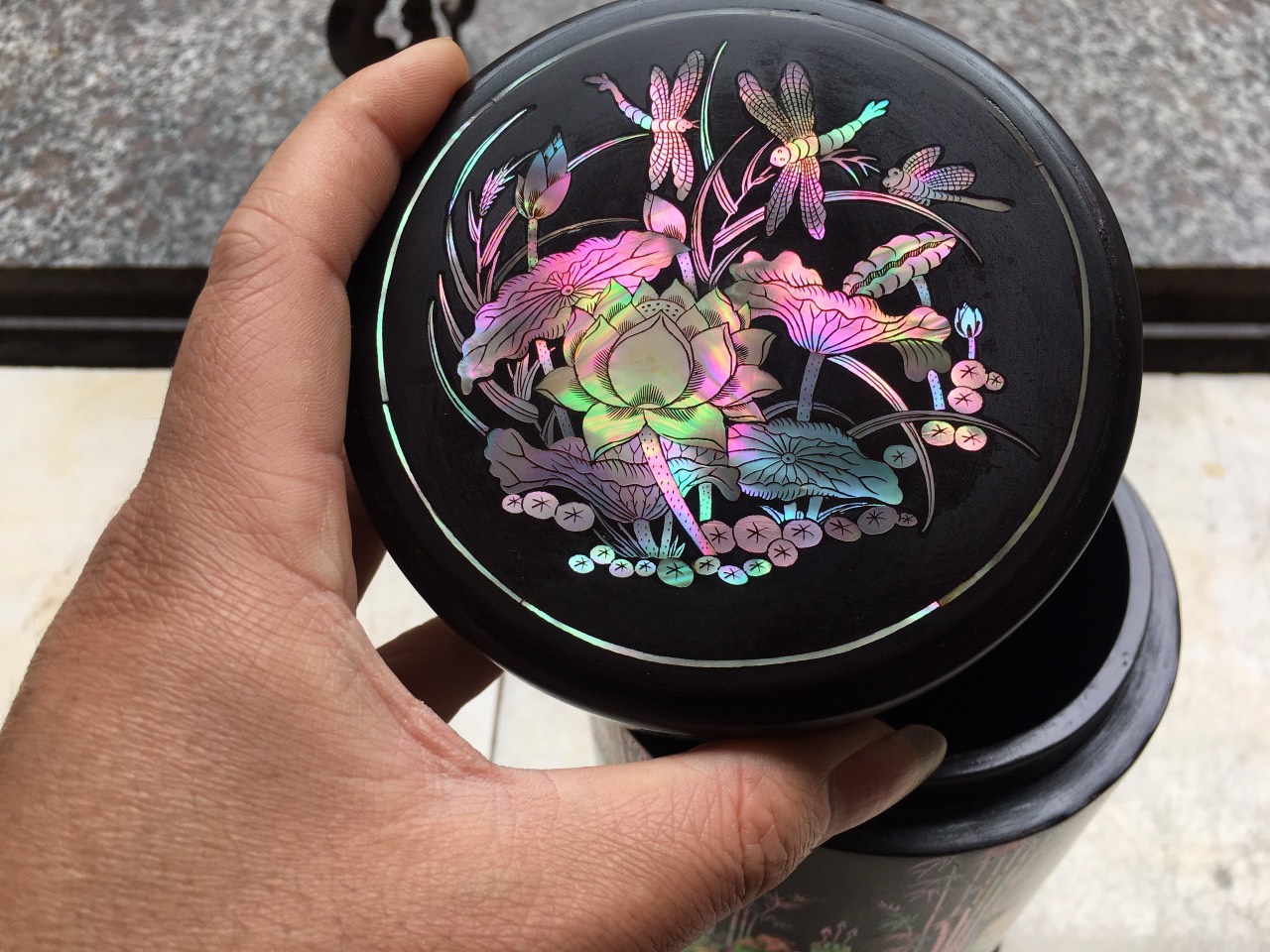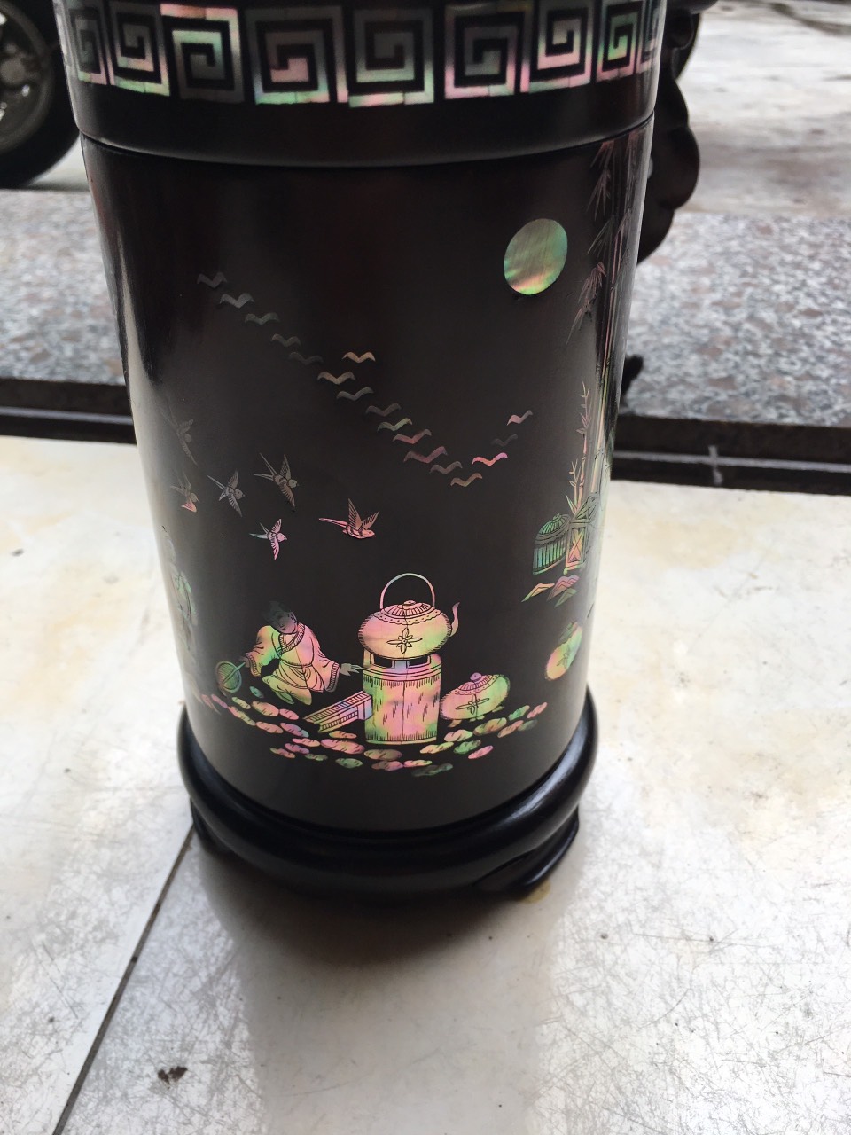_ Hộ đựng trà được tiên khắc kết hợp với khảm ốc đỏ ,rất tỉ mỉ tinh sảo kỳ công ,Ốc đỏ là một loại ốc quý hiếm ,thường xuyên sinh sống ở những nước xa sôi như singgapo và nhật bản ,như ở việt nam biển rất nhiều lên không có ốc ,nếu có thì có rất ít lại không mầu ,Chính vì thế ốc thường được nhập khẩu từ singgapore về rất đắt đỏ ,những bù lại mầu sắc rất đỏ và đẹp ,và được rất nhiều người ưa chuộng cũng như muốn sử hữu 1 sẩn phẩm khảm ốc đỏ như khảm sập gụ tủ chè tranh ảnh ,đặt biệt khảm vào hộp đựng trà ,kết hợp với chất liệu thân gỗ trắc đỏ đen . Đã nâng tầm hộp trà chè với sự sang trọng được đánh giá cao .Hộp đựng trà chè được làm và hoàn thiện do bàn tay khối óc tài hoa từ những người thợ dầy rặn kinh nghiệm ,Cũng như tay nghề cao trong làng nghề truyền thống .Chính vì thế hộp đựng trà đã đáp ứng đầy đủ những tiêu trí ( Đẹp bền rẻ ) Thẩm mỹ nghệ thuật với chất lượng tuyệt vời