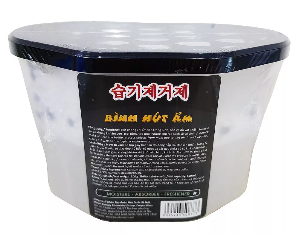 Thông số sản phẩmTên sản phẩm : Bình hút ẩm Hando 450mlHướng dẫn sử dụng : Mở nắp, lột bỏ lớp giấy bạc, giữ lớp giấy thấm và để nơi mình muốn. Không làm rách lớp giấy thấm, thay bình khác khi mực nước xấp xỉ nửa bình.Hướng dẫn bảo quản : Bảo quản nơi khô ráo, thoáng mát, tránh xa tầm với của trẻ em và không ăn đượcThành phần : Calcium super, fragance pelleet, chất chống ẩm mốc, khử mùi…Công dụng : Hút ẩm, chống mốc, giữ đồ vật khô ráo và khử mùi chua mốc hiệu quảDung tích : 450 (ml)Xuất xứ : Việt Nam