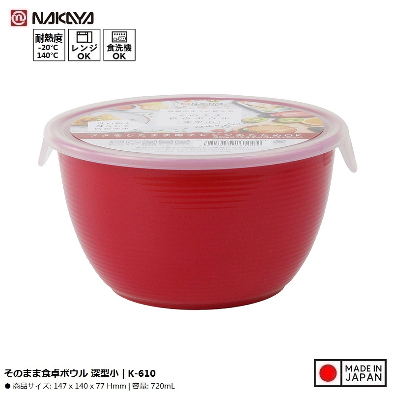 Hộp nhựa dùng trong lò vi sóng Nakaya 720ml ■ Xuất xứ: Nhật Bản | MADE IN JAPAN ■ NSX: Nakaya Chemical Industry Co., Ltd (Japan) ■ Model: K-610 ■ Dung tích: 720ml ■ Kích thước: Ø147x140x77H㎜ ■ Màu