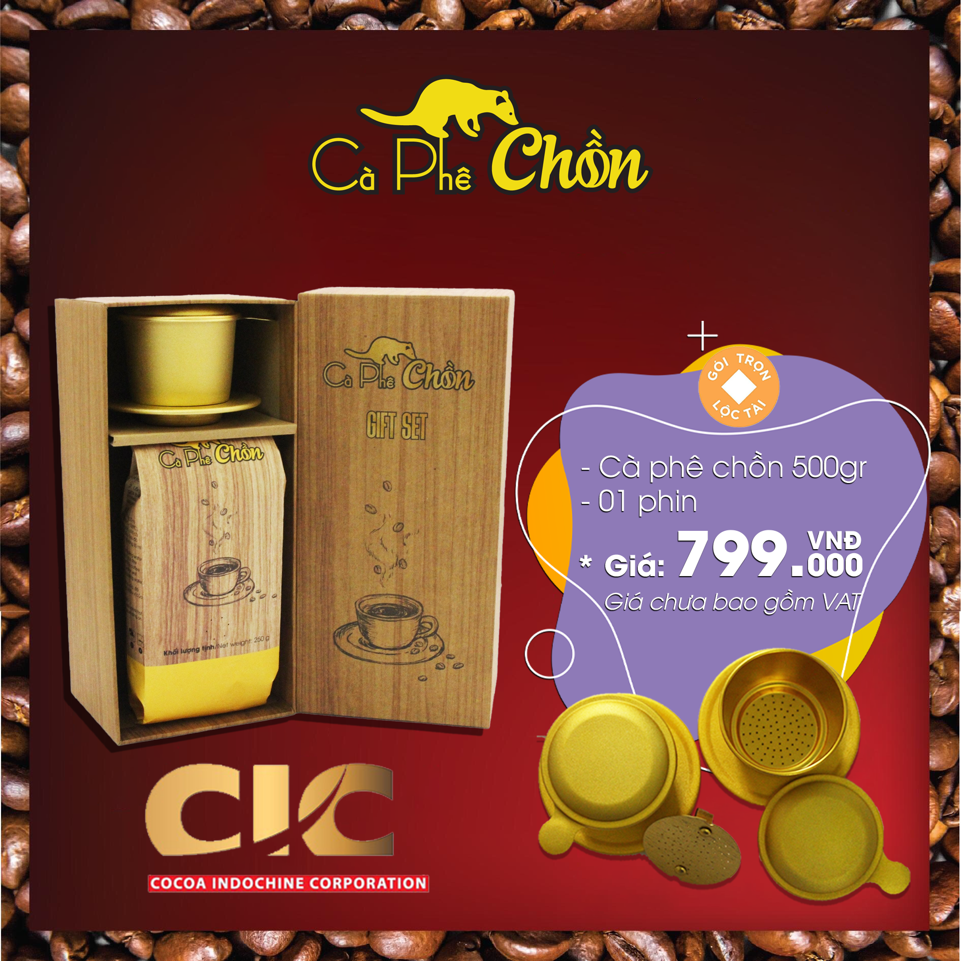 - Sản phẩm gồm: + 1 túi cà phê chồn 500g + 1 phin cà phê mạ màu công nghệ anod đẹp + 1 hộp đựng bằng gỗ nhẹ.