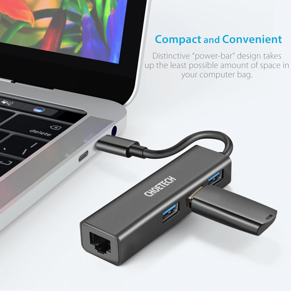 Hub Adapter chuyển đổi 4 in 1 Type-C ra 3 cổng USB 3.0 & cổng LAN RJ45 hiệu CHOETECH U02BK dùng cho Macbook / Laptop (tốc độ cao, kết nối nhiều thiết bị, kết nối internet có dây)