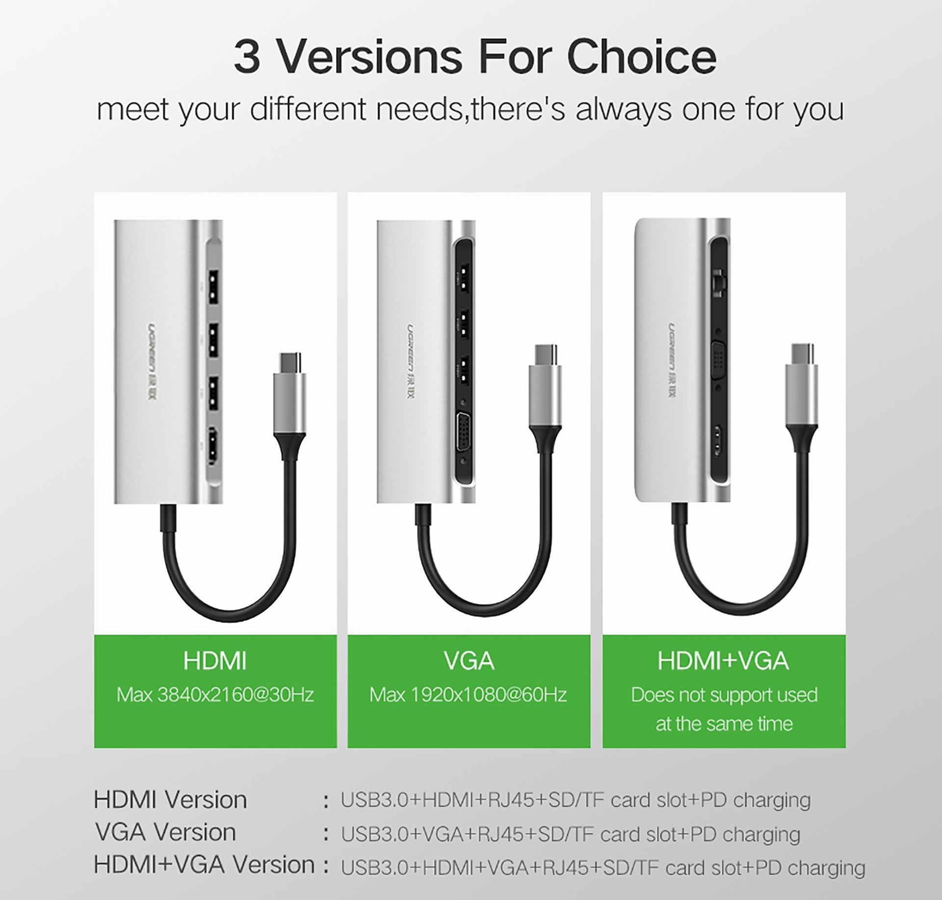 Mua tại TiktokUGREEN 40873 là bộ chuyển đổi tín hiệu từ 1 cổng Type-C ra các cổng HDMI + VGA + RJ45 + Hub USB 3.0 + TF/SD Card + cổng sạc Type-C, là giải pháp hoàn hảo giúp các thiết bị chỉ hỗ trợ 1 cổng USB Type C có thể phục vụ cùng lúc nhiều nhu cầu giải trí, công việc khác nhau một cách tiện lợi hơn, với chất lượng cao cấp đảm bảo mọi tín hiệu luôn ổn định ở mức tối đa. Thông số kỹ thuật